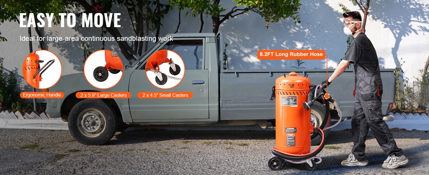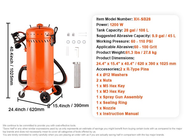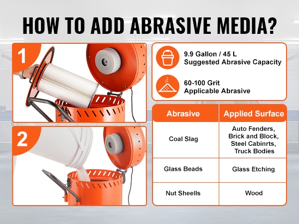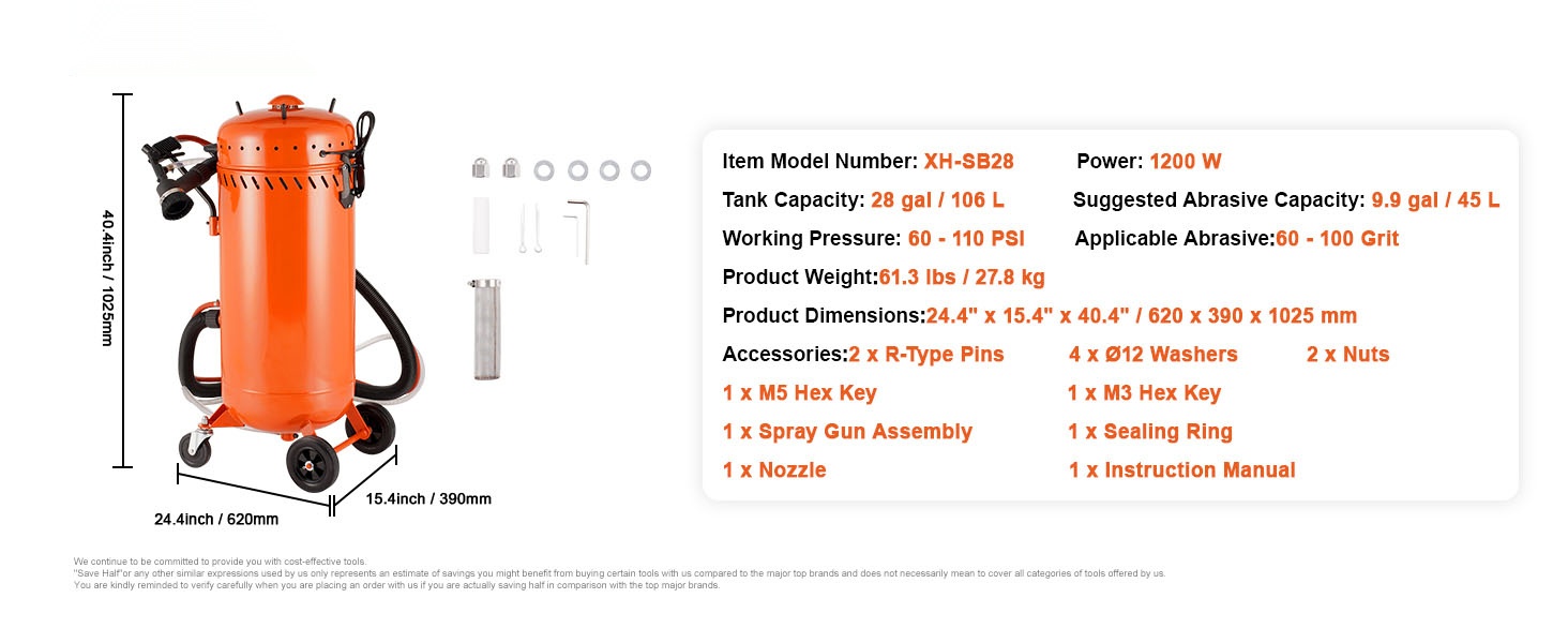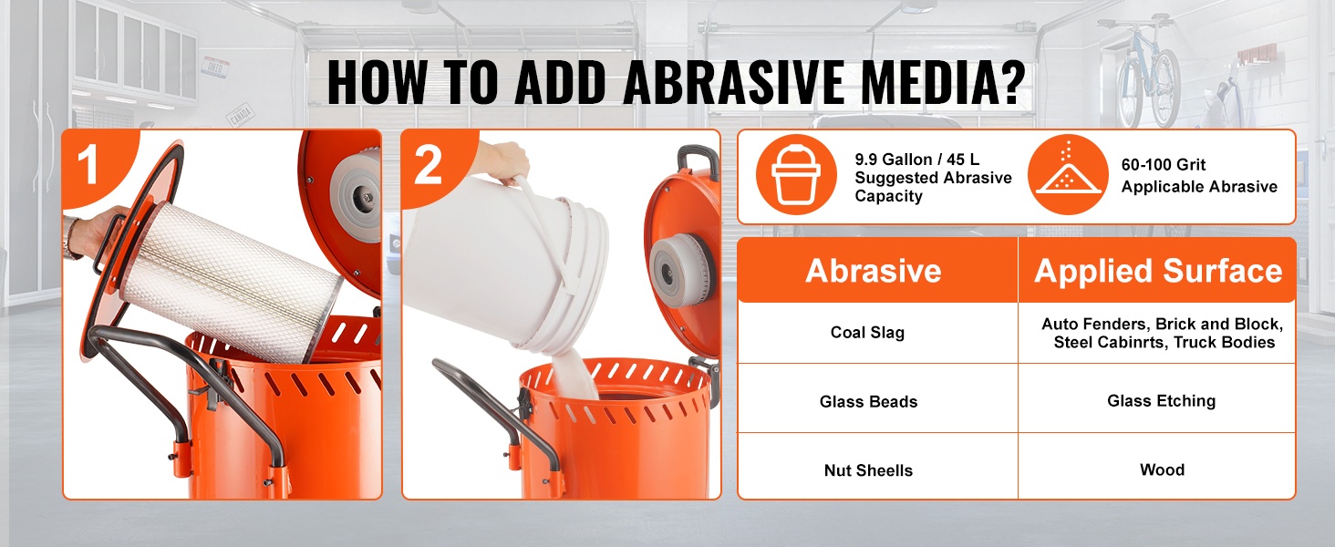 Laite soveltuu moniin käyttökohteisiin ja tukee noin 20–35 lbs hiomamateriaalimäärää. Yhteensopiva 60–100 grit -hiomamateriaalien kanssa, kuten lasikuona, saksanpähkinän kuoret, rautamalmahiekka, piihiekka ja alumiinioksidi. Käyttöpainealue on 60–110 PSI ja ilman kulutus 6–22,5 cfm.