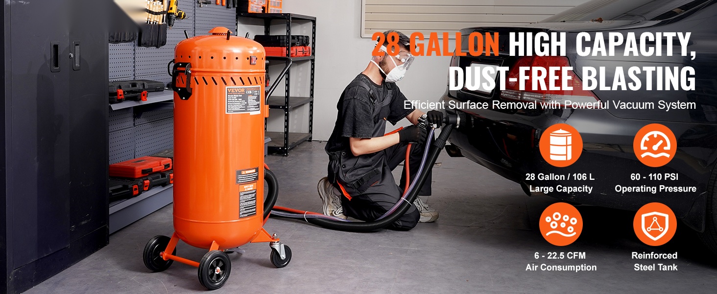Tämä 28 gallonan tyhjiöhiekkapuhallin yhdistää tehokkaan 1200 W turbiinipölynimujärjestelmän ja raskaan käytön hiekkapuhallussäiliön. Järjestelmä soveltuu erityisesti ajoneuvojen ja erilaisten laitteiden pintakäsittelyyn. Jopa 90 %:n hiomamateriaalin talteenotto parantaa tehokkuutta ja pienentää käyttökustannuksia.
