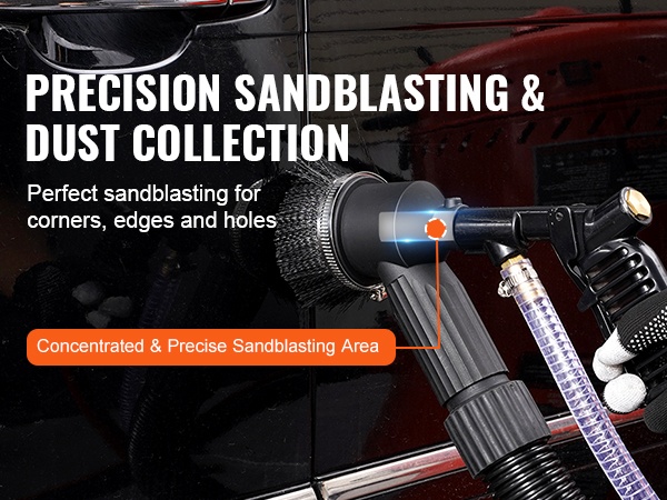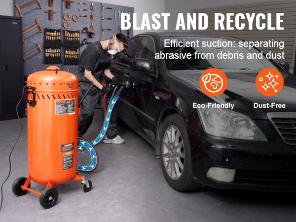 Raskaan käytön hiekkapuhallussäiliössä on kaksinkertainen kansirakenne ja tiheä verkkosuodatin, jotka ehkäisevät pölyn karkaamista. Ne suodattavat tehokkaasti roskat ja mahdollistavat hiomamateriaalin kierrätyksen. Sisäänrakennettu tehokas moottori yhdessä tyhjiöharjalla varustetun puhalluspistoolin kanssa kerää pölyn nopeasti ja tehokkaasti.