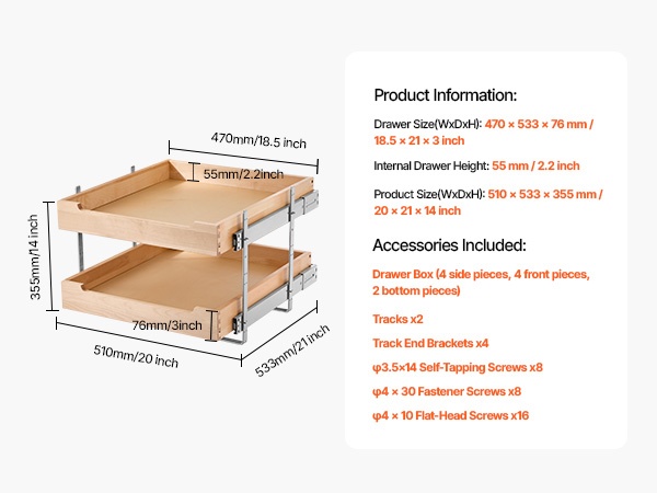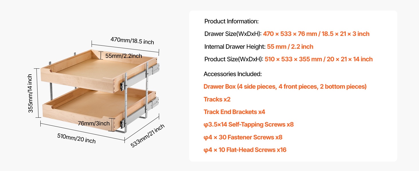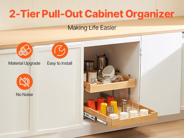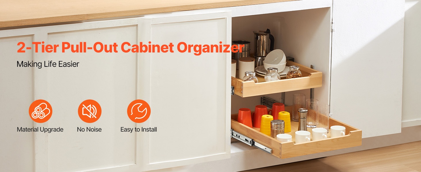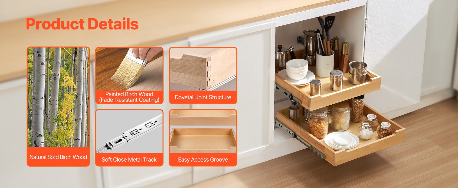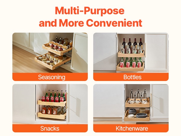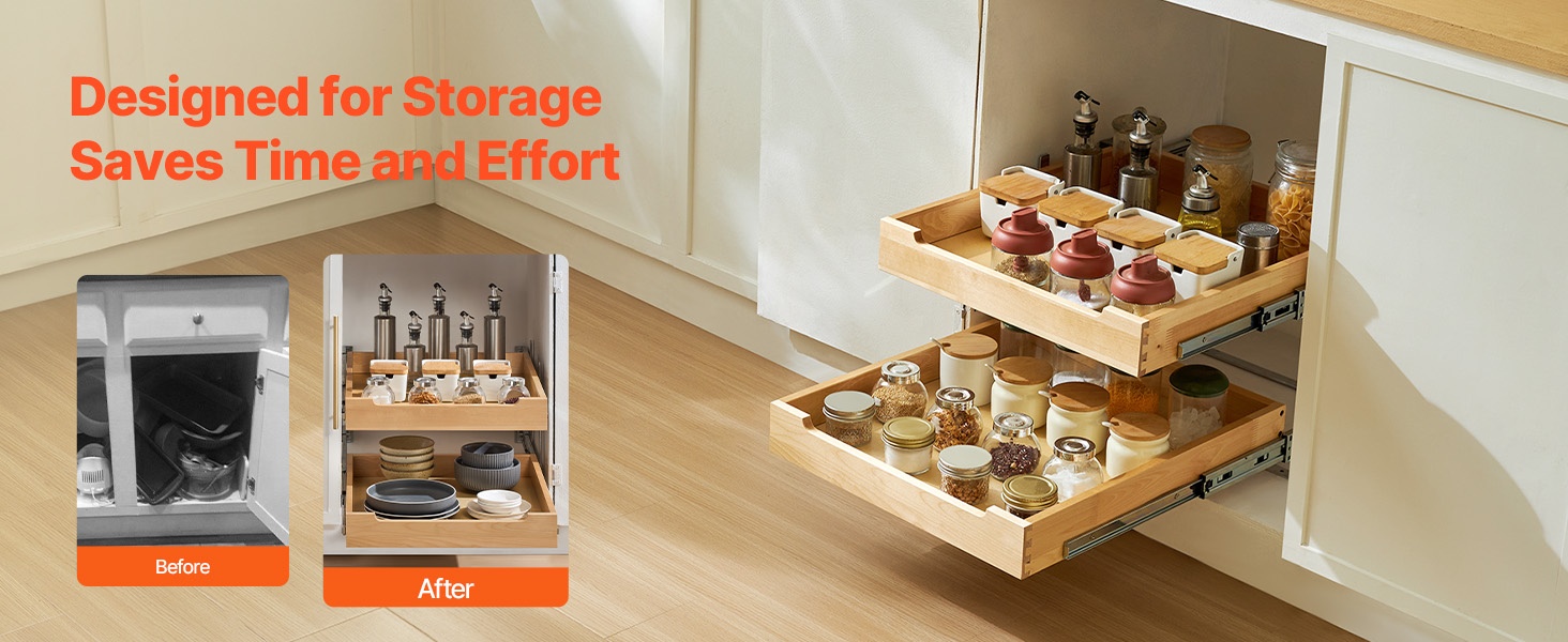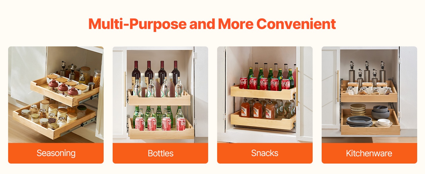 Tämä pehmeästi sulkeutuva ulosvedettävä puuhylly sopii keittiökaappeihin, altaan alle sekä muihin säilytyskaappeihin. Se auttaa hyödyntämään koko kaapin syvyyden ja tekee tavaroiden järjestämisestä ja löytämisestä helpompaa.
