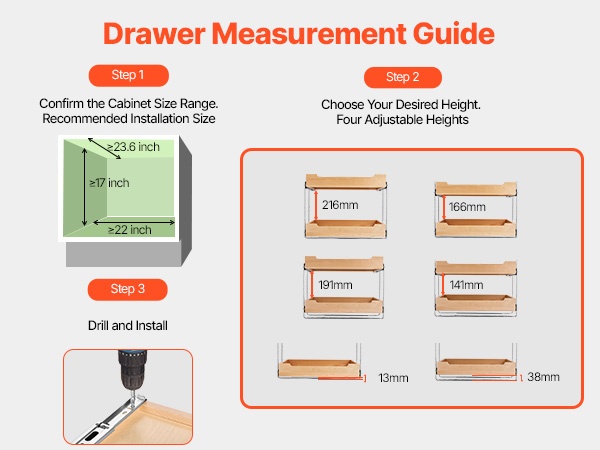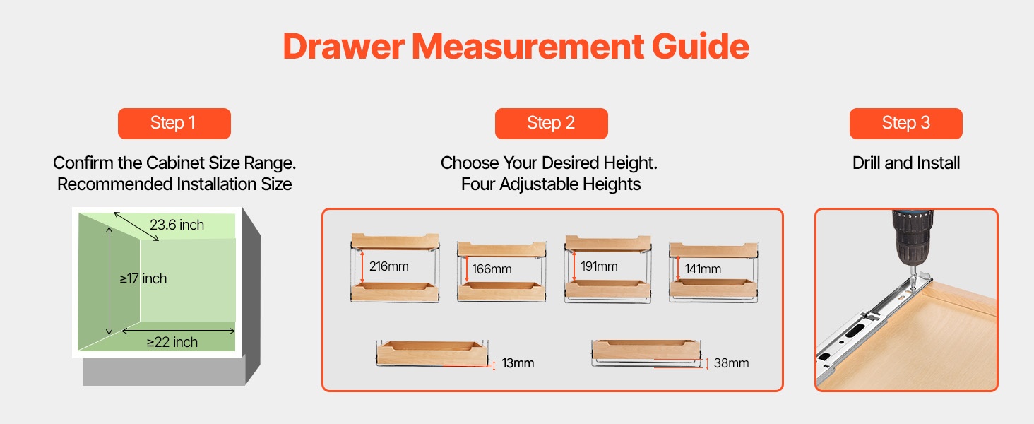 Järjestäjässä on 4 säädettävää korkeutta, joten säilytystila on helppo mukauttaa erikokoisille astioille ja tarvikkeille. Asennus on suoraviivainen, ja mukana tulevat selkeät ohjeet sekä tarvittavat kiinnitystarvikkeet.