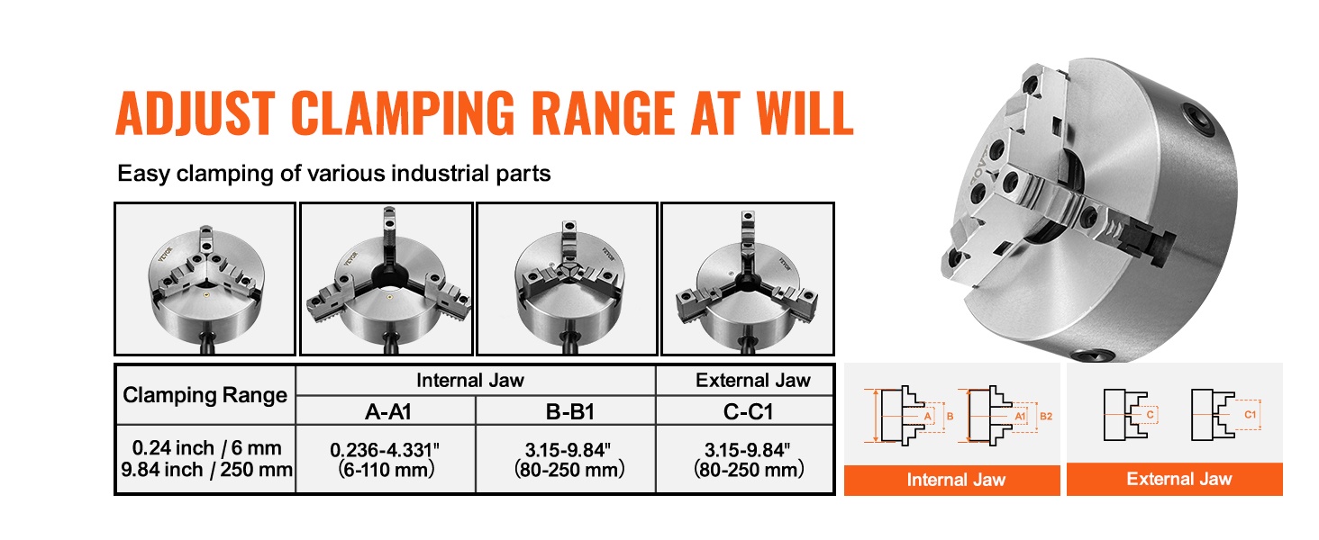 Pakkauksen mukana toimitetaan kahta tyyppiä olevat leuat: sisäleuat ja ulkoleuat. Niiden avulla voidaan kiinnittää eri kokoisia ja myös suurikokoisia teollisia työkappaleita. Leukojen avaaminen ja sulkeminen onnistuu helposti T-muotoista avainta kiertämällä.