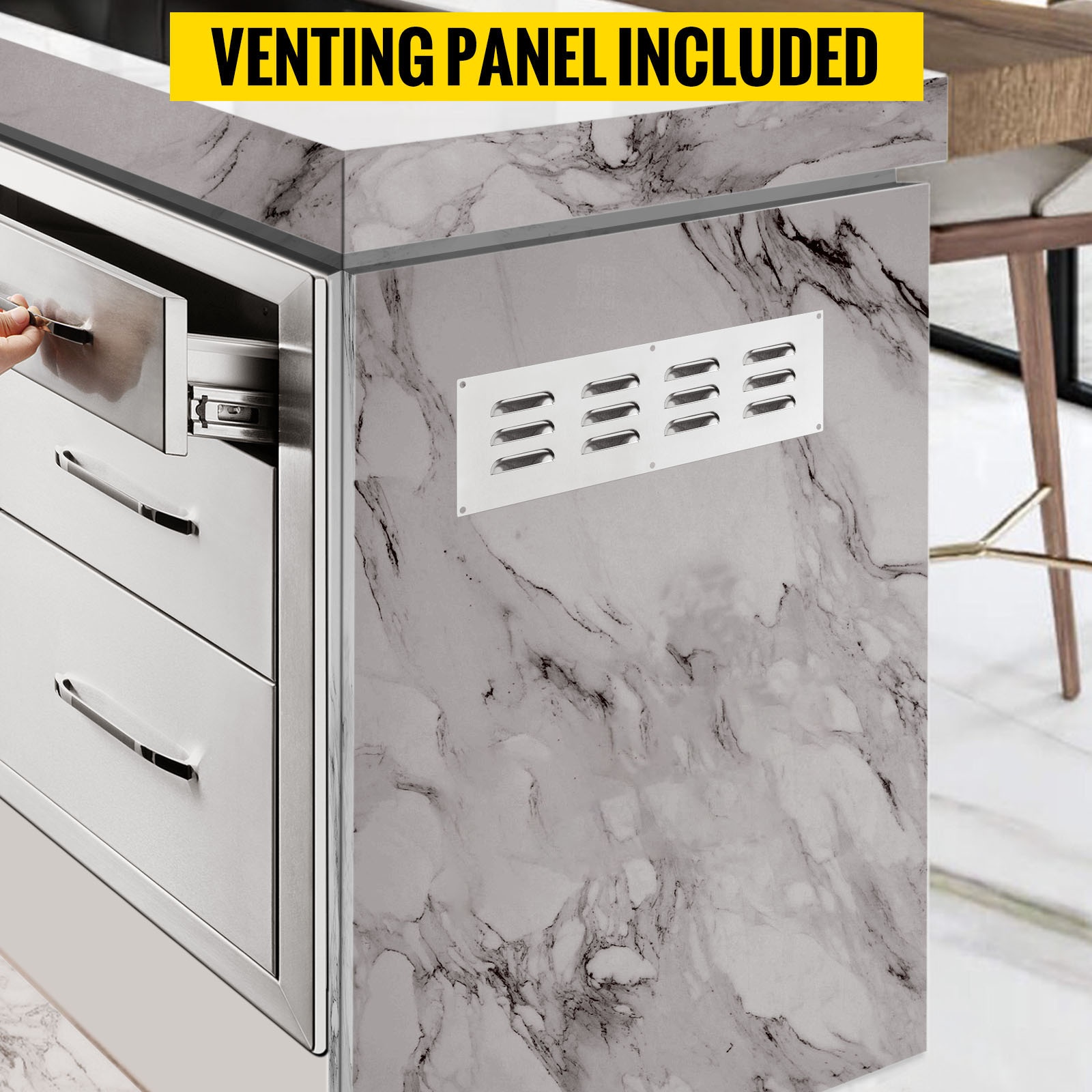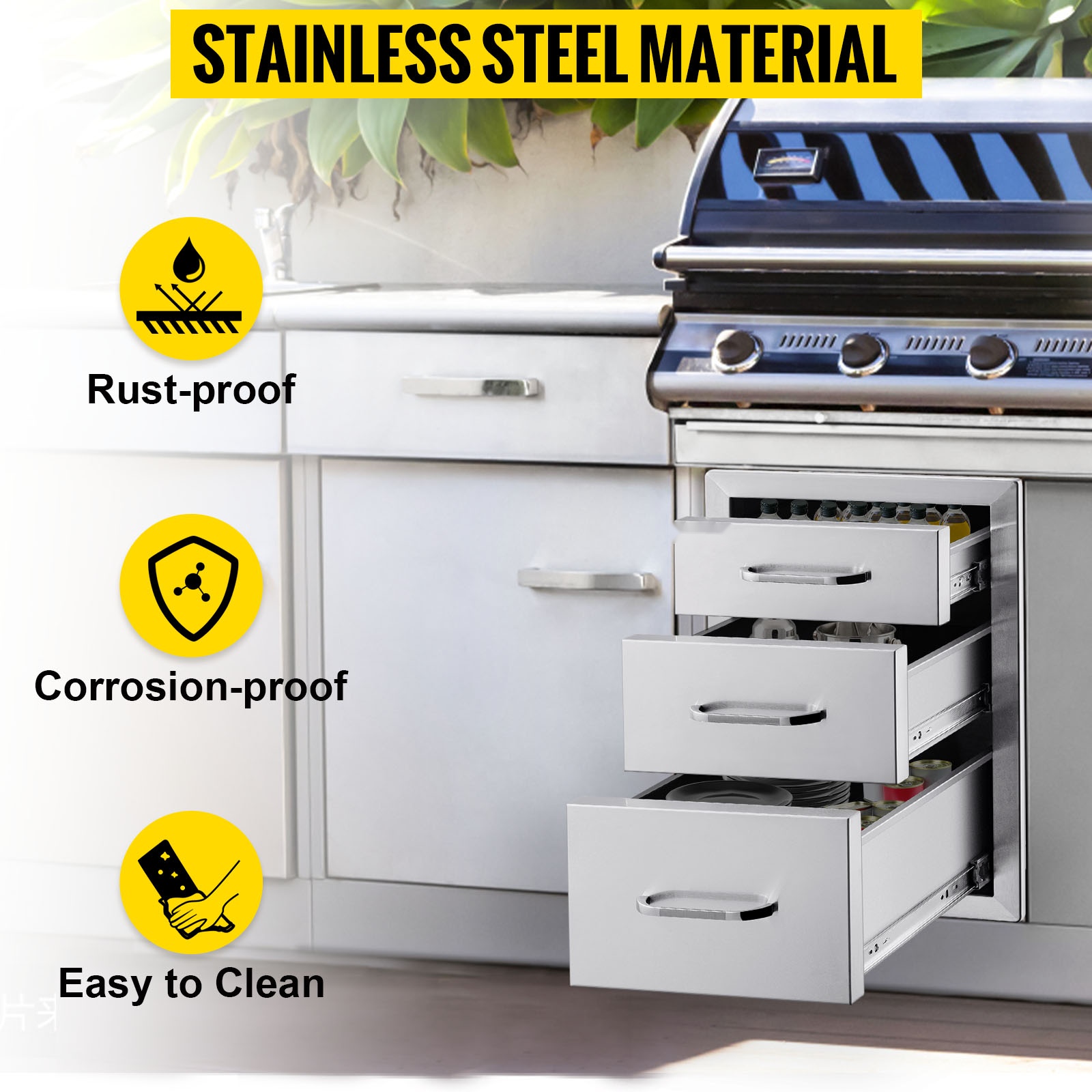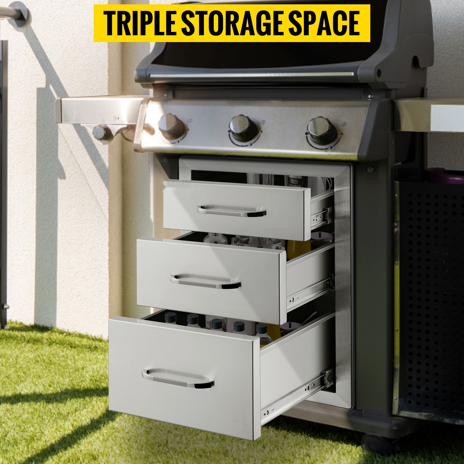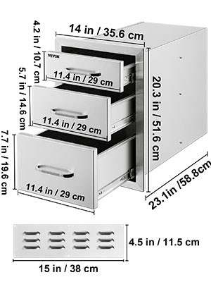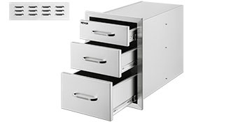 Tämä kolmitasoinen ulkokeittiön laatikkomoduuli tarjoaa runsaasti säilytystilaa grilleihin, ulkokeittiöihin ja BBQ-saariratkaisuihin. Paksusta 201-ruostumattomasta teräksestä valmistettu rakenne kestää säätä, on helppo puhdistaa eikä jätä tahroja. Suljetut laatikot ja mukana tuleva ilmanvaihtopaneeli auttavat pitämään tarvikkeet suojassa ja takaavat hyvän ilmanvaihdon ulkokeittiön ympärillä.Tärkeimmät ominaisuudet: