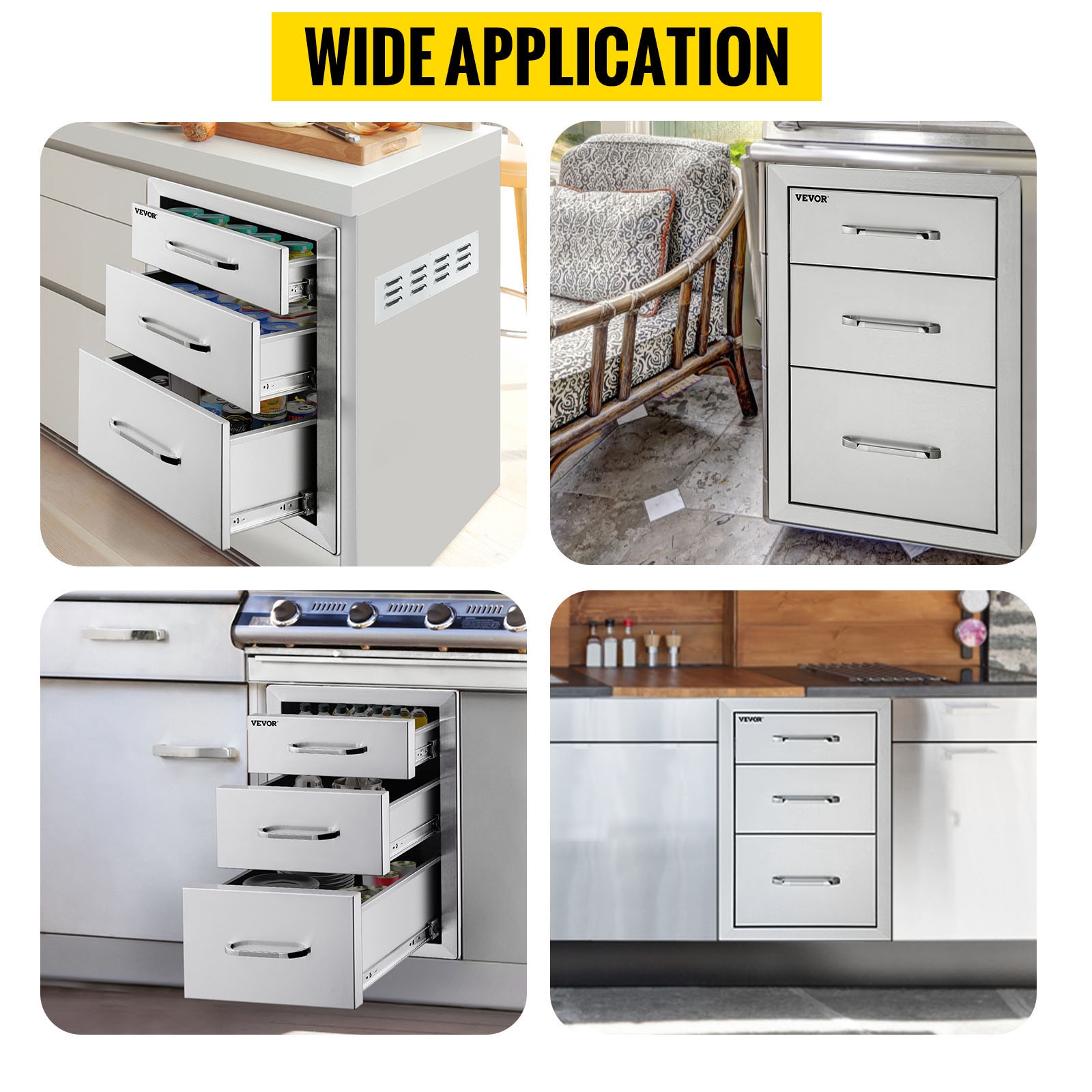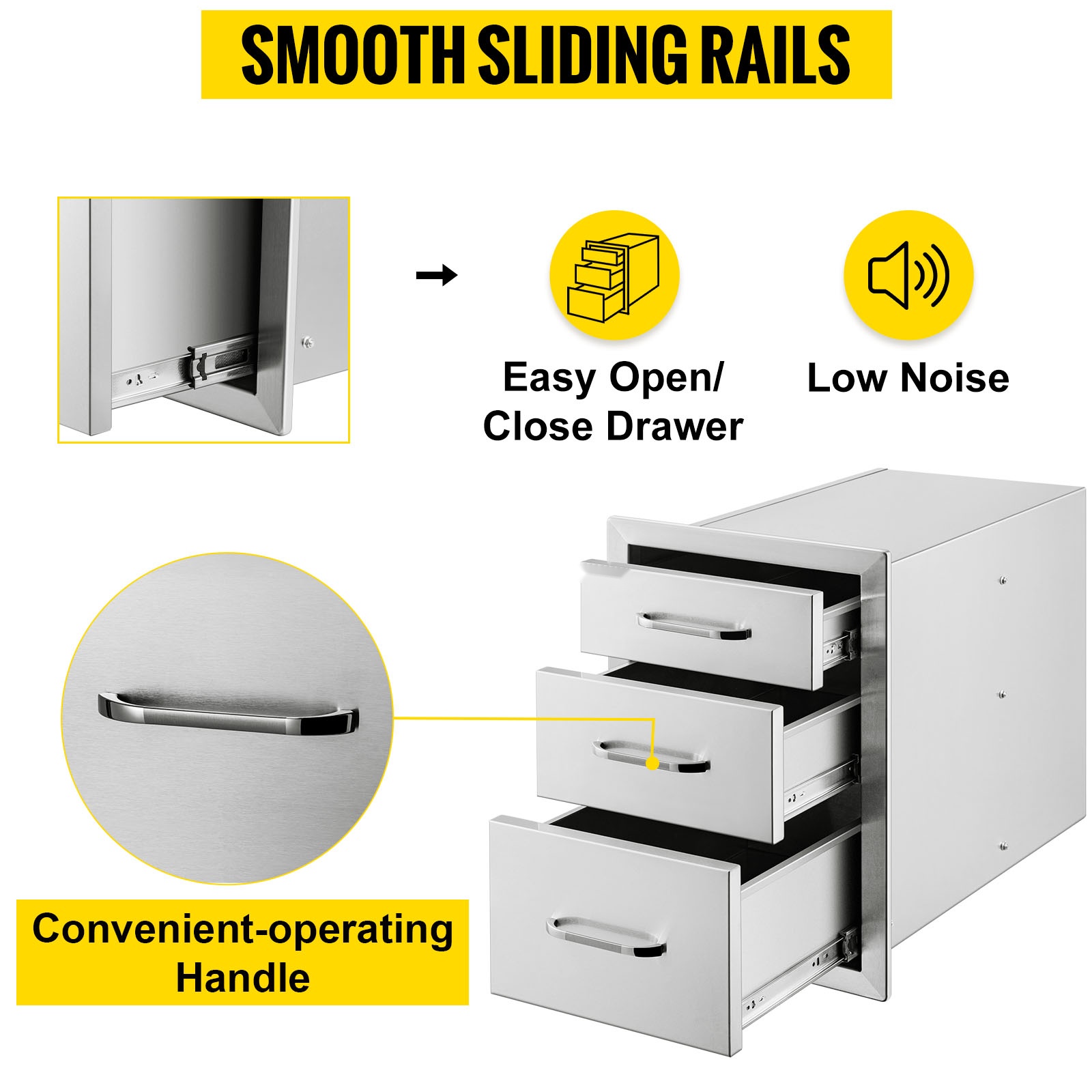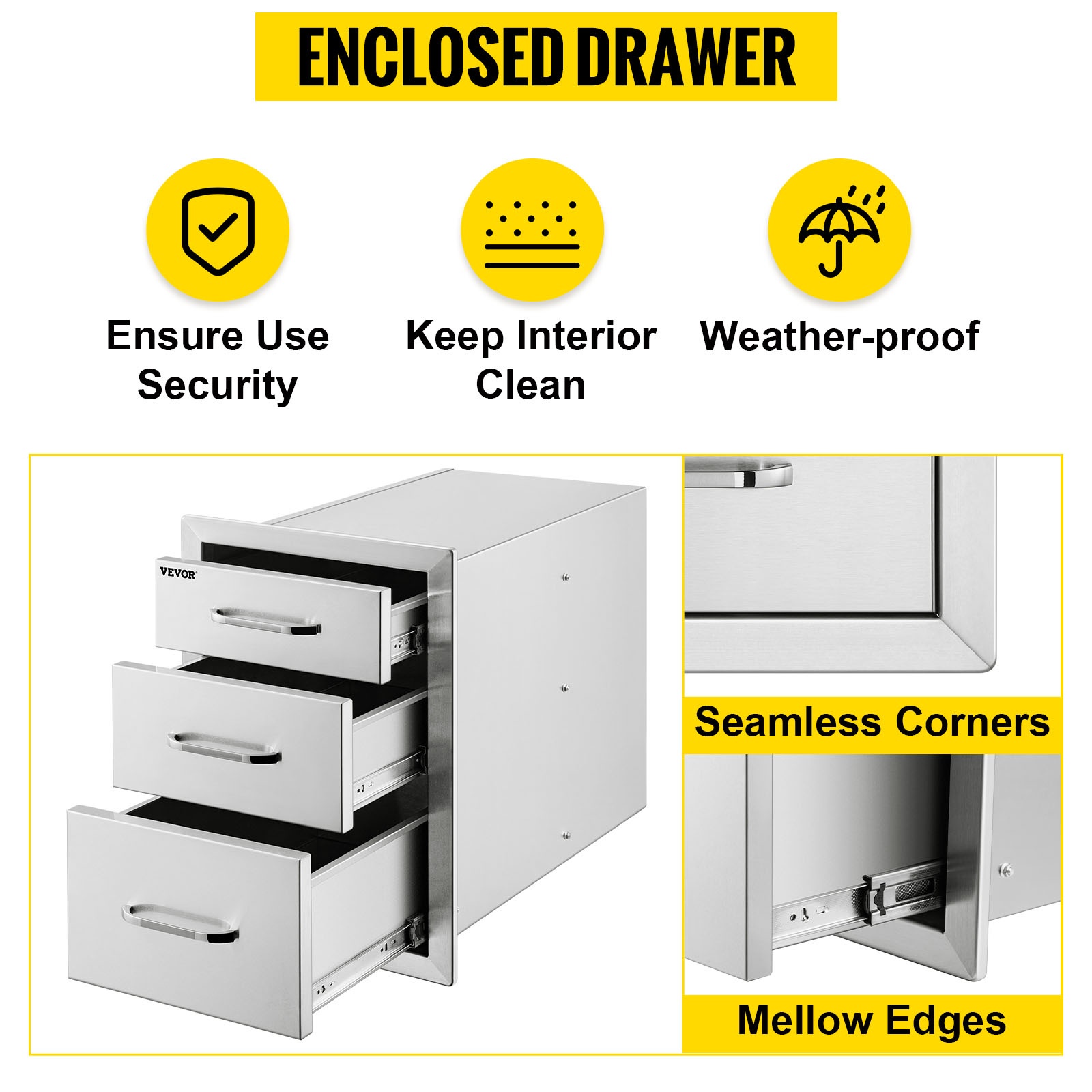 Tämä kolmitasoinen ulkokeittiön laatikkomoduuli tarjoaa runsaasti säilytystilaa grilleihin, ulkokeittiöihin ja BBQ-saariratkaisuihin. Paksusta 201-ruostumattomasta teräksestä valmistettu rakenne kestää säätä, on helppo puhdistaa eikä jätä tahroja. Suljetut laatikot ja mukana tuleva ilmanvaihtopaneeli auttavat pitämään tarvikkeet suojassa ja takaavat hyvän ilmanvaihdon ulkokeittiön ympärillä.Tärkeimmät ominaisuudet: