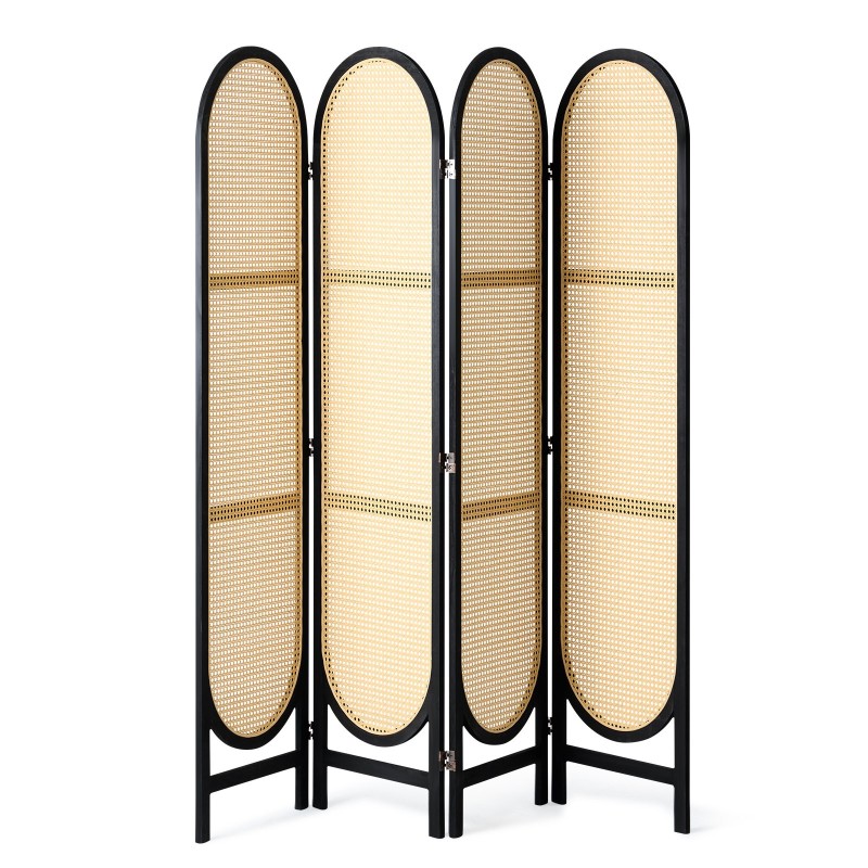 Tyylikäs 4-paneelinen huoneenjakaja tuo yksityisyyttä ja pehmeää rajausta eri tilojen välille. Käsin punottu rottinki ja massiivinen puurunko luovat lämpimän, hieman vintagetyylisen ilmeen olohuoneeseen, makuuhuoneeseen tai työtilaan.