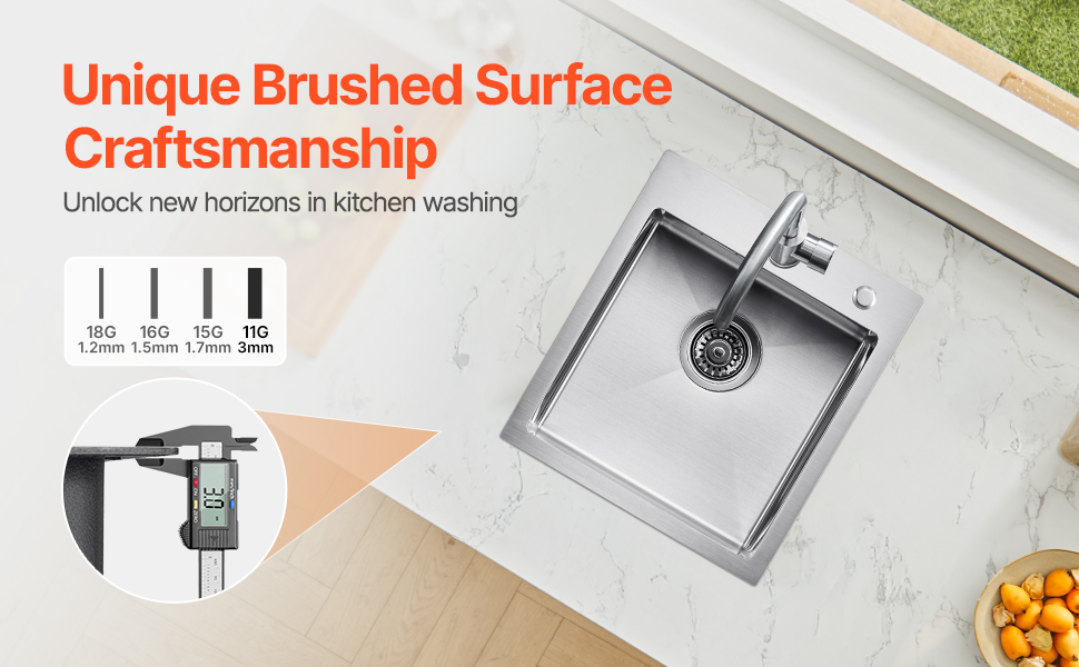 Yläpuolelta asennettava (top-mount) malli sopii useimpiin työtasoihin ilman suuria muutostöitä. 3 mm paksu 304-ruostumattomasta teräksestä valmistettu reuna mahdollistaa tukevan asennuksen, ja paksu allasrunko lisää kestävyyttä.