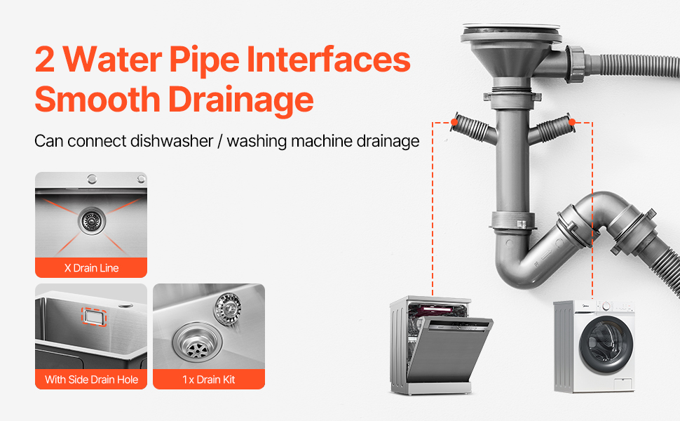 Altaan pohjassa on X-muotoinen viemäröintimuotoilu, joka ohjaa veden nopeasti viemäriin ja ehkäisee vesilammikoiden syntymistä. Mukana tuleva viemärisarja takaa sujuvan vedenpoiston. Sivulla oleva viemäriaukko, jossa on 2 putkiliitäntää, mahdollistaa astianpesukoneen tai muiden laitteiden helpon kytkemisen.