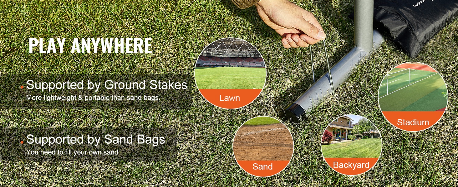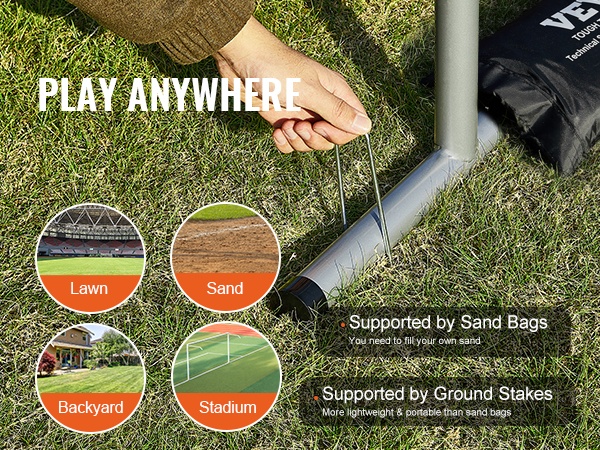 Verkko soveltuu monenlaisille kentille ja voidaan tukea kahdella tavalla. Voit käyttää maakiiloja kevyempään ja helposti siirrettävään kokoonpanoon tai esimerkiksi hiekkasäkkejä lisävakautta varten.