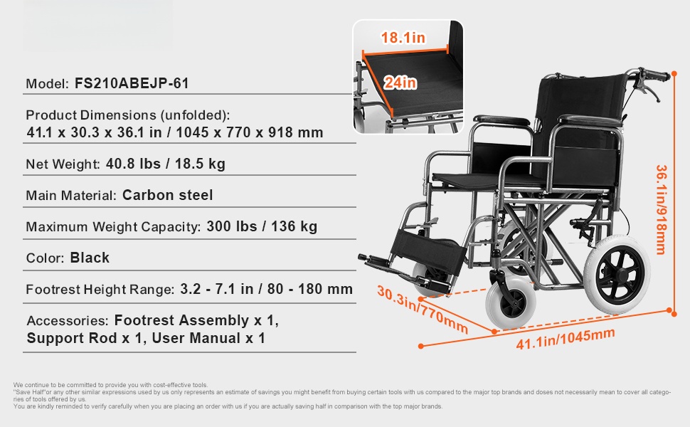 Aikuisten taitettava hiiliteräksinen siirtymispyörätuoli, leveä 61 cm istuin, kantavuus 136 kg, musta