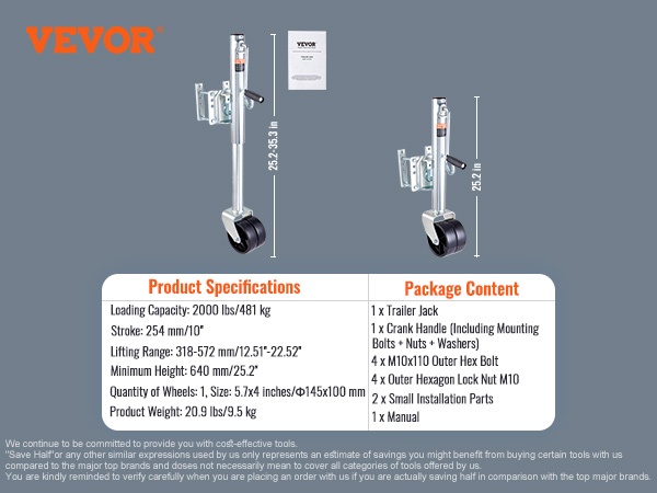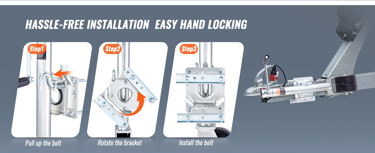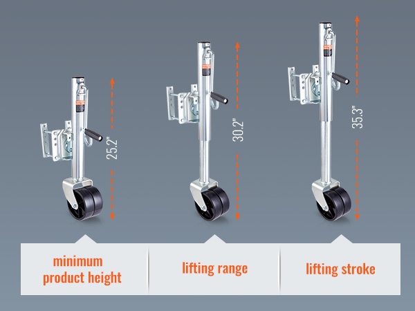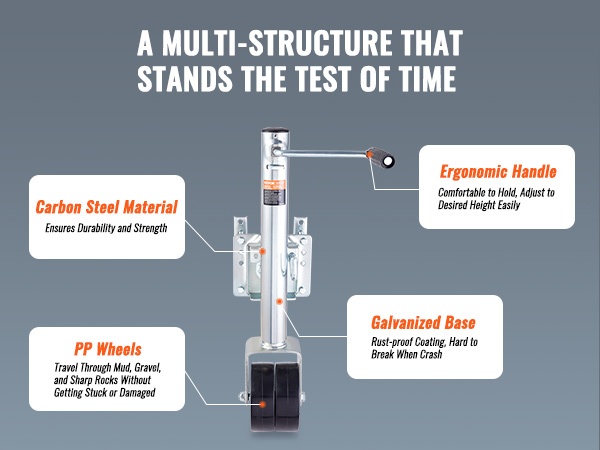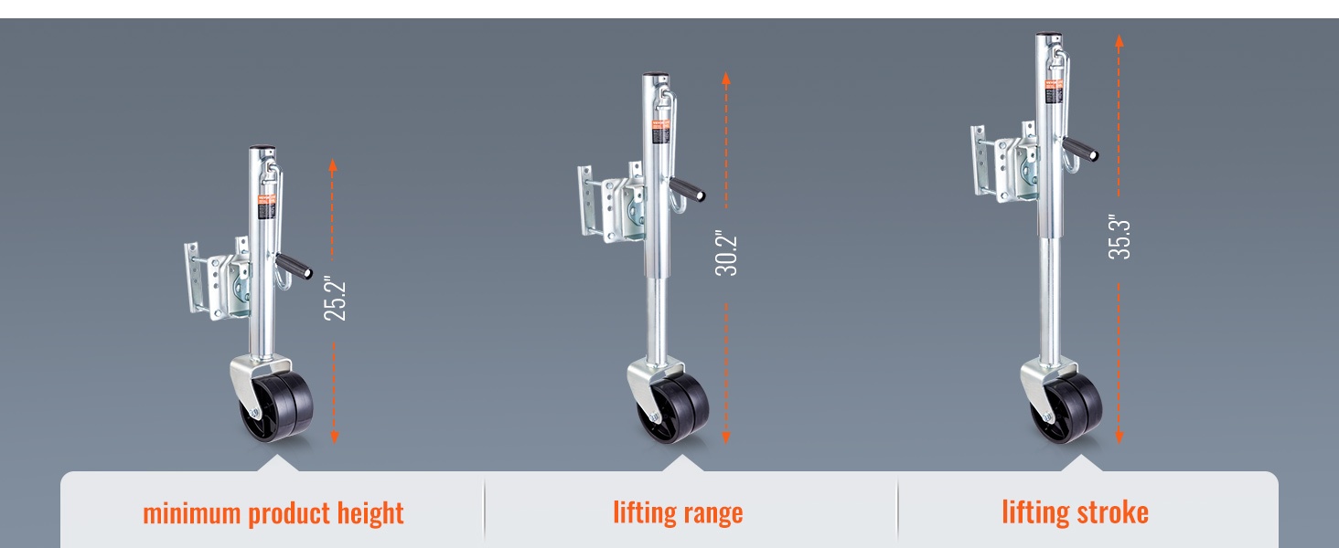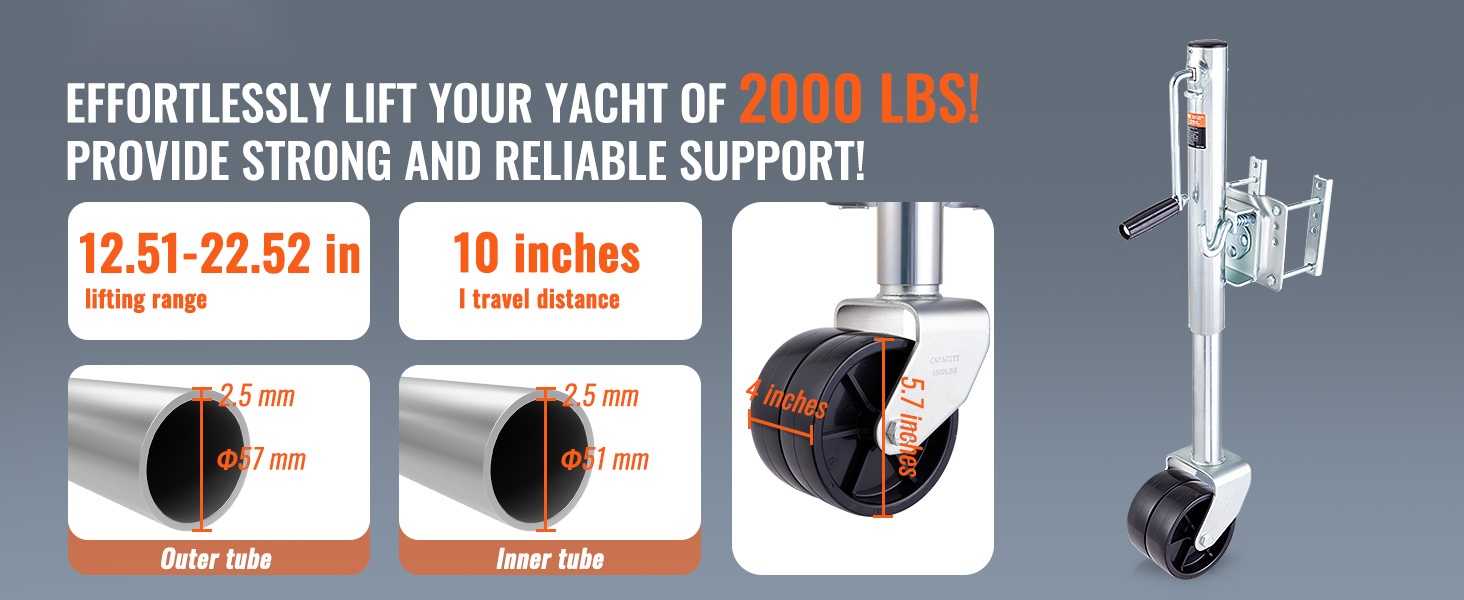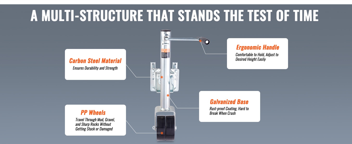Perävaunun tunkki tarjoaa jopa 2000lb kantavuuden, joten se soveltuu hyvin vene-, matkailu-, hevos- ja hyötyperävaunujen sekä jahtiperävaunujen käsittelyyn. PP-pyörä antaa leveän kosketuspinnan, mikä helpottaa perävaunun siirtämistä ja parantaa vakautta epätasaisellakin alustalla.
