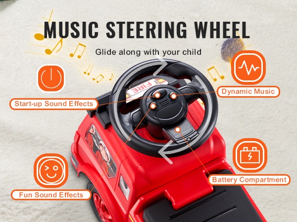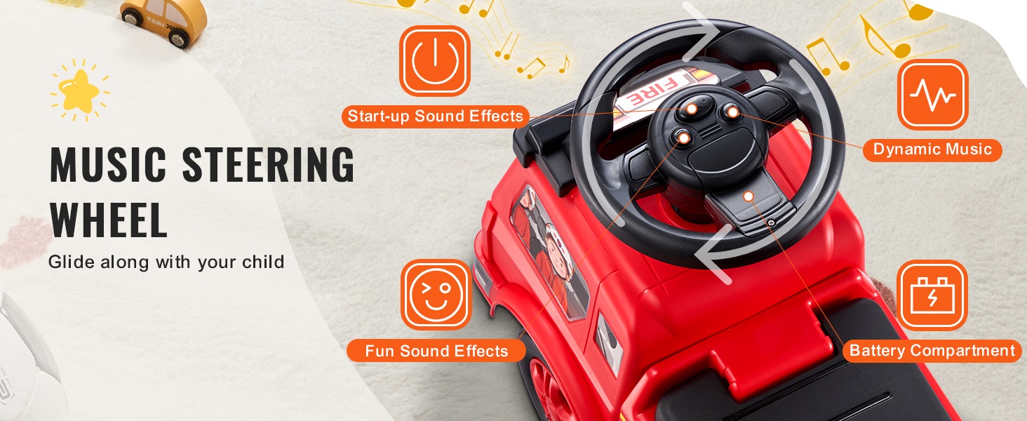 Moottorin jylinä, torven äänet ja iloinen musiikki herättävät mielikuvituksen ja tekevät ajamisesta lapselle entistäkin viihdyttävämpää.