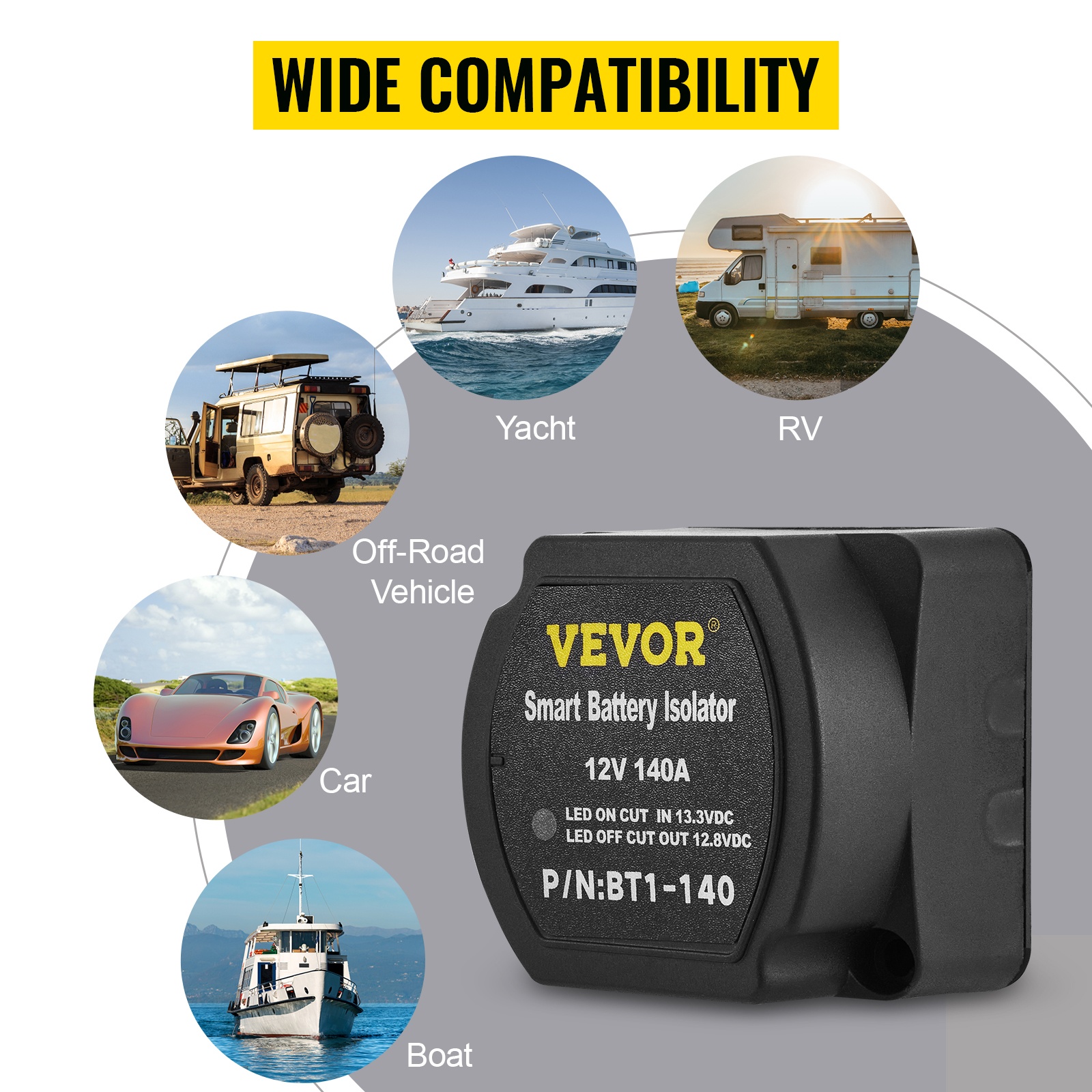 12V 140A akkujen erotusrelesarja mahdollistaa lisävarusteiden käytön erillisestä akusta ajoneuvon moottorin ollessa sammutettuna. Samalla se pitää pääakun ladattuna ja varmistaa, että ajoneuvo on aina käyttövalmis. Sarja sisältää kaikki tarvittavat osat asennukseen, ja se soveltuu useimpiin autoihin, matkailuautoihin, pakettiautoihin, kuorma-autoihin, asuntovaunuihin, veneisiin, jahteihin, ATV- ja UTV-ajoneuvoihin sekä muihin vastaaviin käyttökohteisiin.