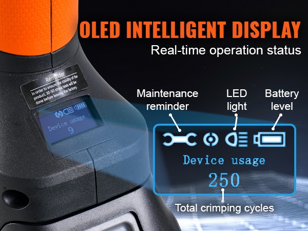 - OLED-näyttö näyttää akun tason, työtilan ja puristustiedot reaaliaikaisesti.