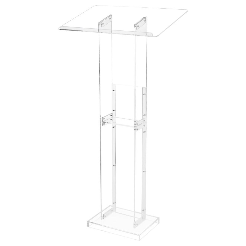 Akryylinen puhujakoroke noin 119 senttimetriä korkea läpinäkyvä leveä pöytätaso säilytyshyllyllä