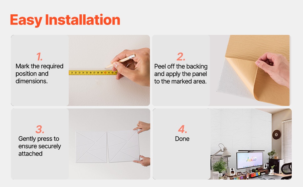 Taustassa on 3M-itsekiinnittyvä teippi, joten paneelit voidaan kiinnittää suoraan puhtaille ja tasaisille pinnoille ilman erillisiä kiinnikkeitä tai porausta. Paneelit voidaan asetella vierekkäin tai erilaisiksi kuvioiksi tilan ja sisustuksen mukaan.