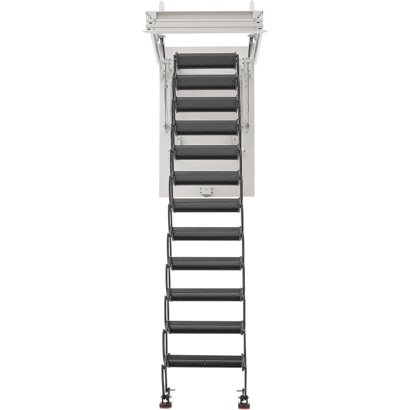 Tämä alasvedettävä ullakkoportaikko sopii 9.5–10.2 ft / 2.9–3.1 m kattokorkeudelle ja 39.4 x 27.5 tuumaa / 1000.76 x 698.5 mm asennusaukkoon. Vankka teräs-, alumiini- ja puurunko, luistamattomat askelmat sekä ergonomiset kaiteet helpottavat ja turvaavat kulkemista ullakolle. Portaikko voidaan vetää alas mukana tulevalla vetotangolla ja taittaa ylös, kun sitä ei käytetä.