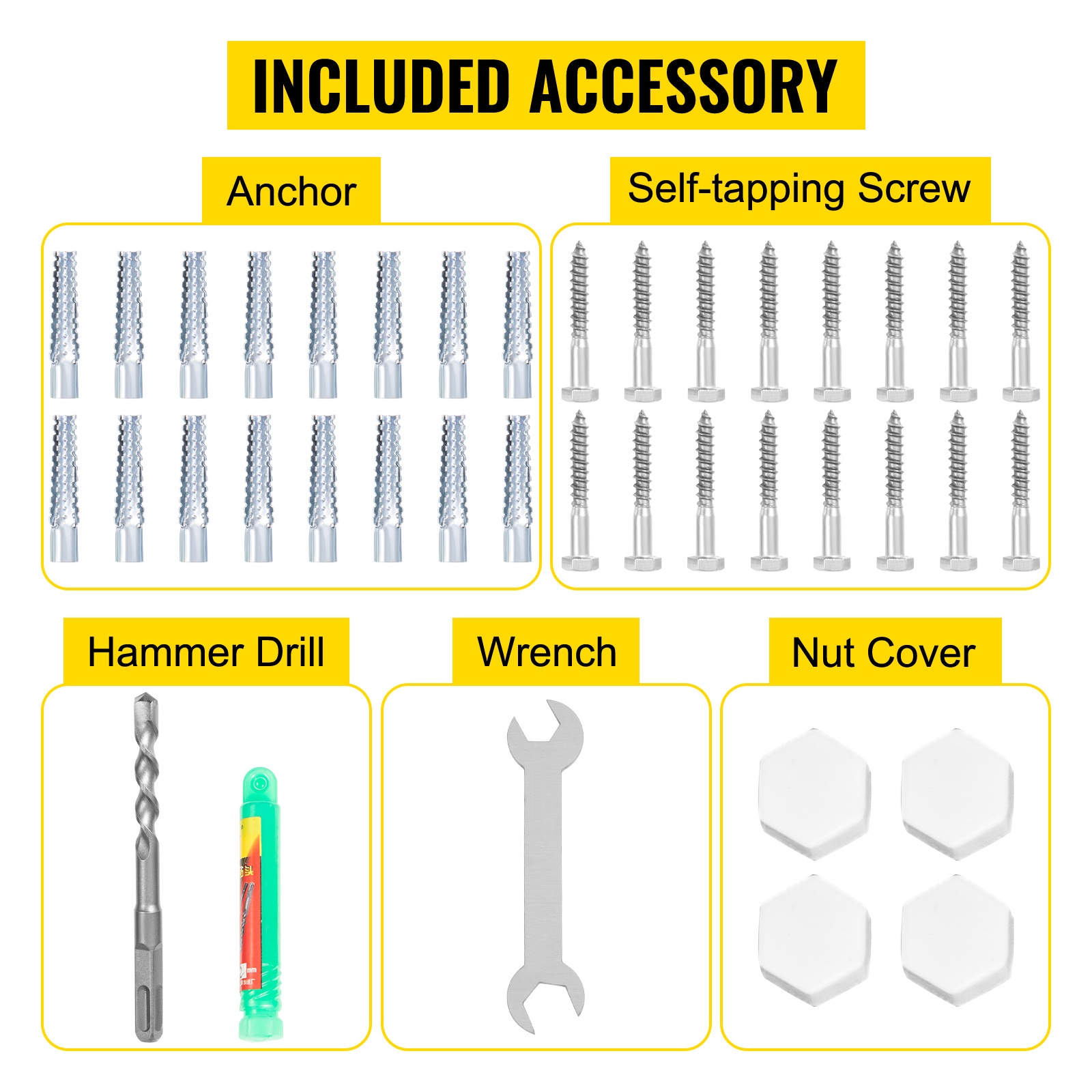 Pakkaukseen sisältyvät poranterä M8, kiinnitysankkurit, itsekierteittävät ruuvit, mutterinsuojat ja nylon-kahvasuoja, joten erillisiä lisäosia ei tavallisesti tarvita perusasennukseen.