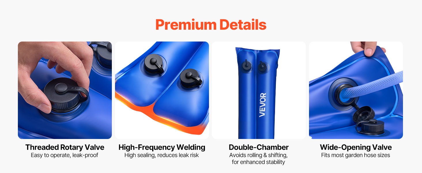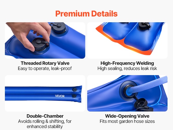 Integroitu kierteellinen venttiili mahdollistaa tasaisen ja vuotamattoman täytön. Levennetty täyttöaukko sopii useimpiin puutarhaletkuihin, ja noin 0.59 tuuman (1.5 cm) levyiset, korkeataajuisella hitsausmenetelmällä tehdyt reunasaumat parantavat tiiviyttä. Kaksikammiorakenne estää pussien pyörimisen voimakkaassa tuulessa ja lisää vakautta.