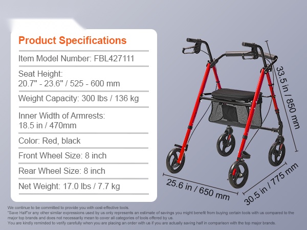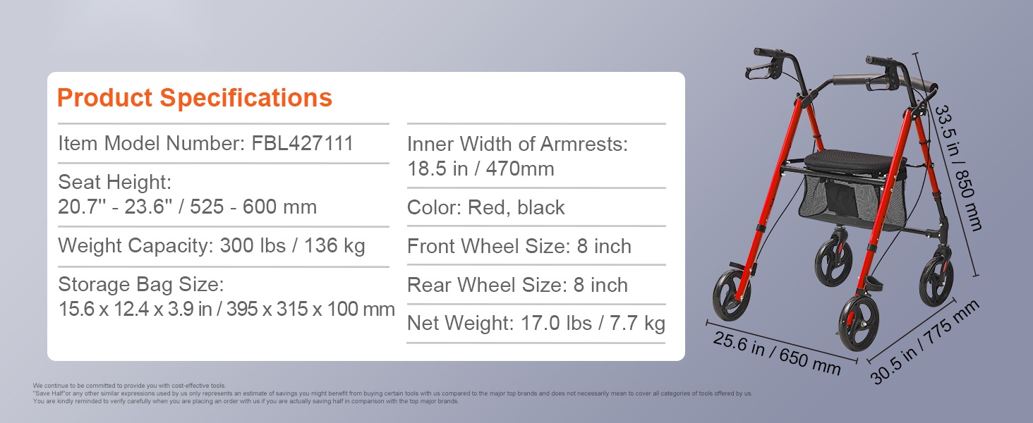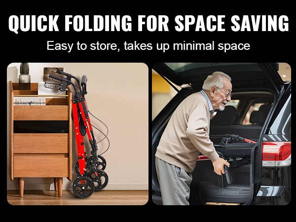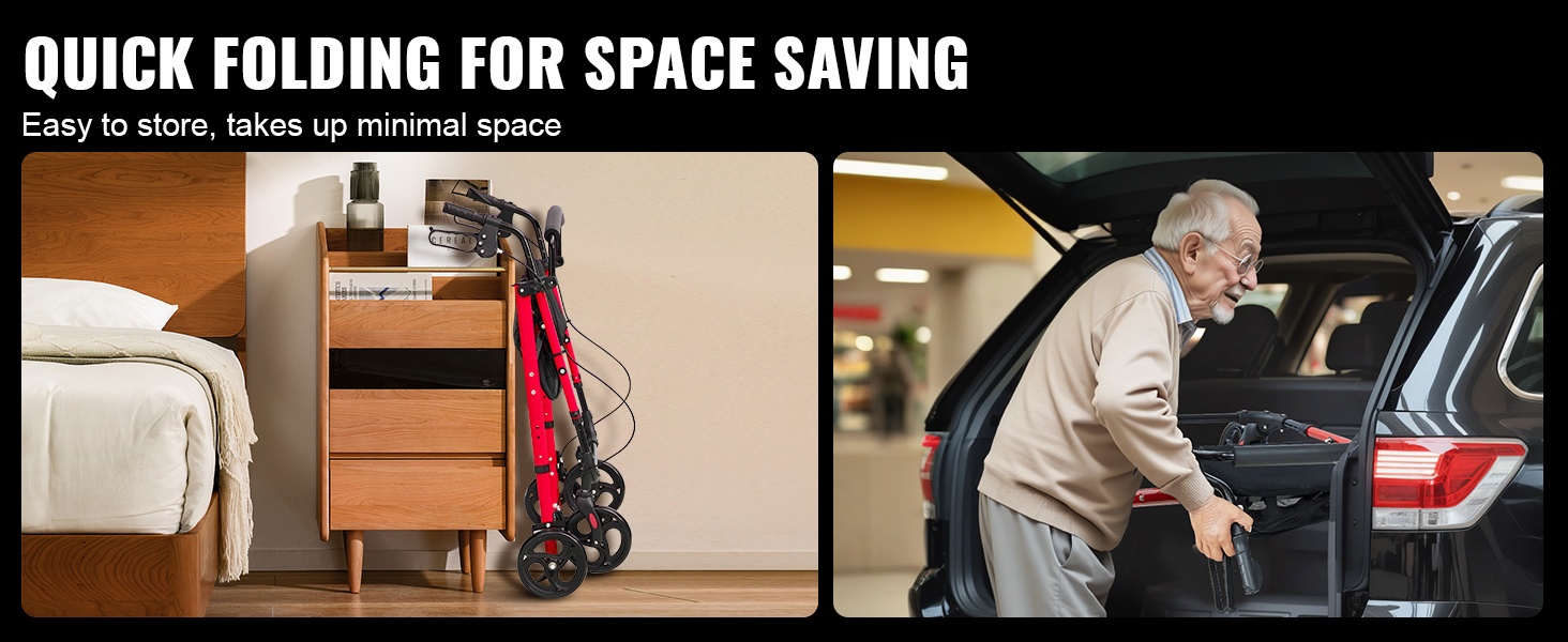 Rollaattori taittuu yhdellä liikkeellä, mikä helpottaa säilytystä ja kuljettamista. Paino on vain 11.6 lbs / 5.26 kg, joten apuvälineen nostaminen auton tavaratilaan tai siirtäminen säilytykseen onnistuu kevyesti.