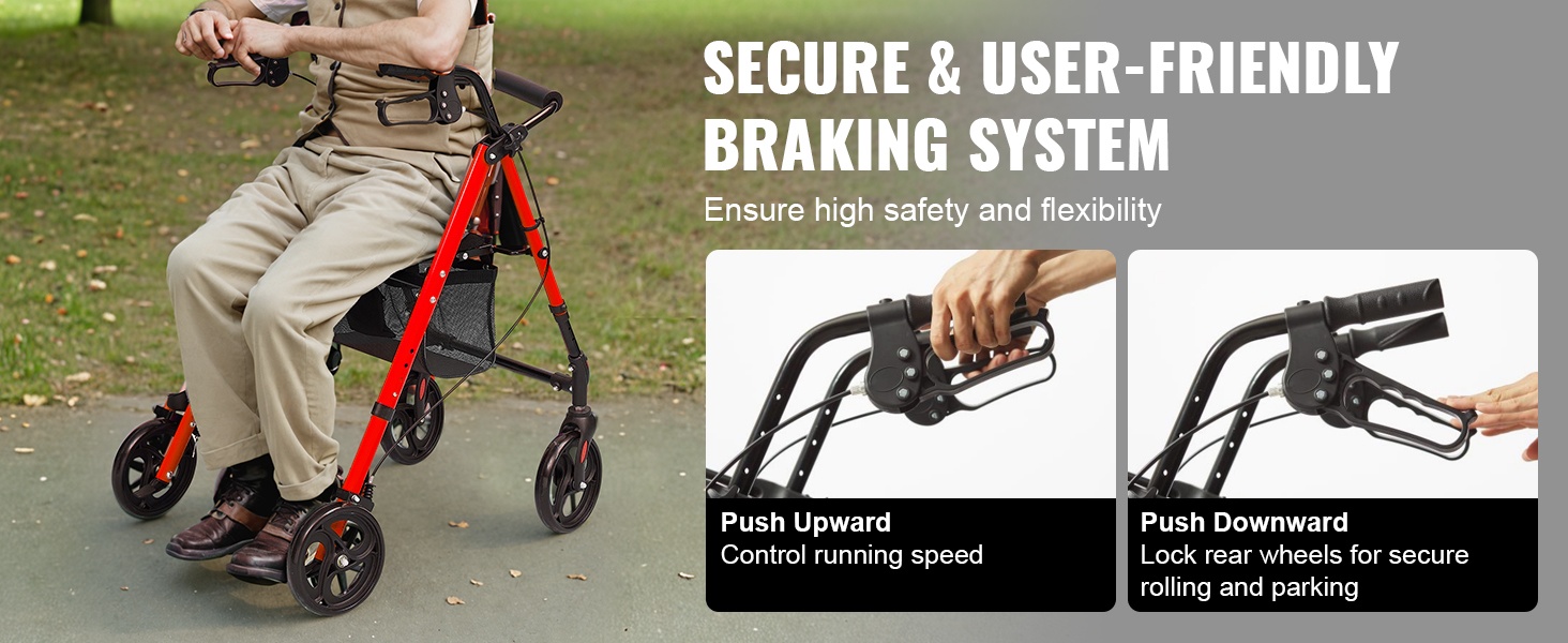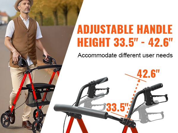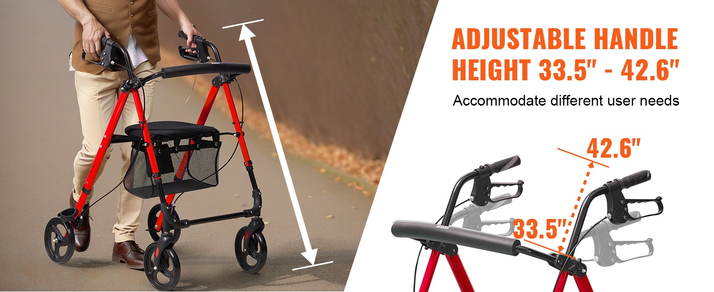 Korkeussäädettävä työntökahva helpottaa oikean ja mukavan kävelyasennon löytämistä. Ergonominen kahva on säädettävissä välillä 33.8–38.8 tuumaa, jotta rollaattori voidaan sovittaa käyttäjän pituuteen ja kävelytyyliin.