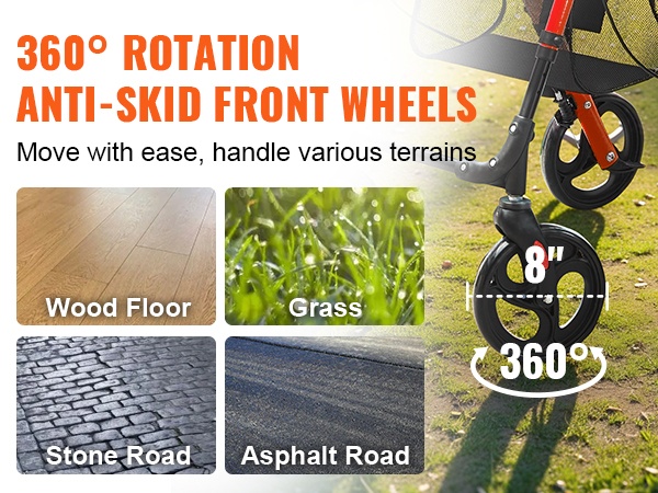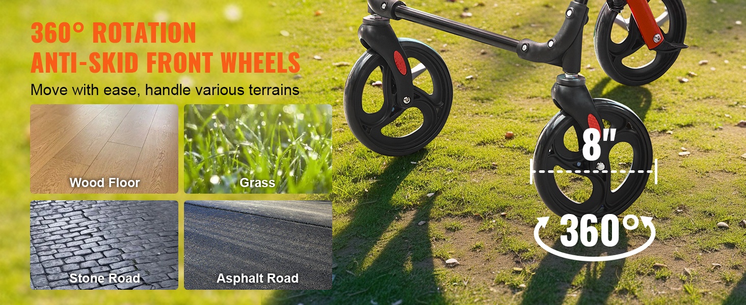 360° kääntyvä, liukastumista estävä etupyörä helpottaa kääntymistä ja suunnanvaihtoa ahtaissakin tiloissa. Sekä edessä että takana on 8-tuumaiset pyörät, jotka liikkuvat sujuvasti erilaisilla alustoilla. Pintakuvioitu, pitävä kulutuspinta parantaa pitoa ja tekee liikkumisesta vakaampaa.