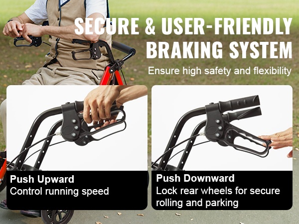 Käsijarrujärjestelmä lisää turvallisuutta ja hallittavuutta. Nopeutta hallitaan työntämällä jarrukahvaa kevyesti ylöspäin, ja takapyörät voidaan lukita painamalla kahvaa alaspäin esimerkiksi pysähtymisen tai paikoillaan seisomisen ajaksi.