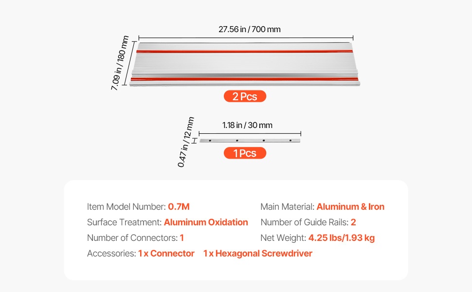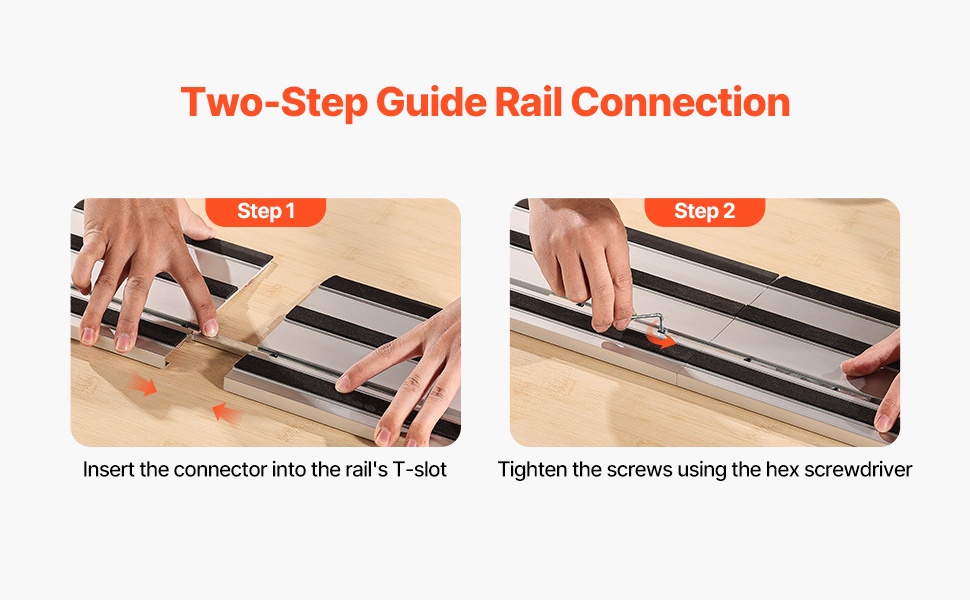 Ohjainkiskot on valmistettu painevaletusta alumiinista, ja anodisoitu pinta parantaa kovuutta ja kulutuskestävyyttä. Mukana toimitettujen liittimien, kuusiokoloavaimen ja ruuvien avulla kiskot on helppo ja turvallinen yhdistää ilman ylikiristämisen riskiä. Pitkät leikkuut voidaan tehdä yhdellä asetuksella, mikä vähentää työn uudelleenasettelua ja parantaa työskentelyn sujuvuutta.