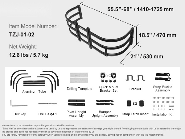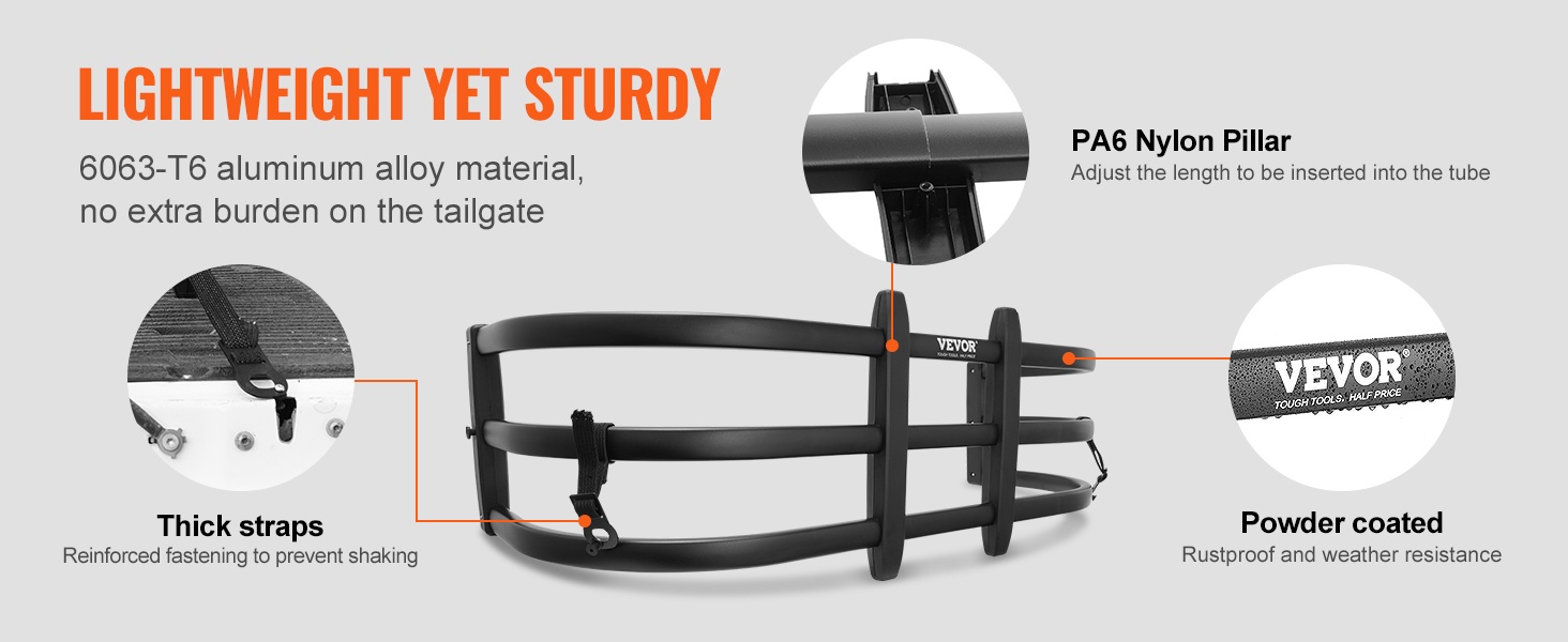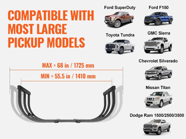 - Säädettävä pituus: 141–173 cm (55.5–68 tuumaa) sopii useimpiin avolava-autoihin