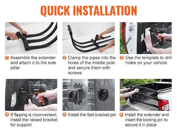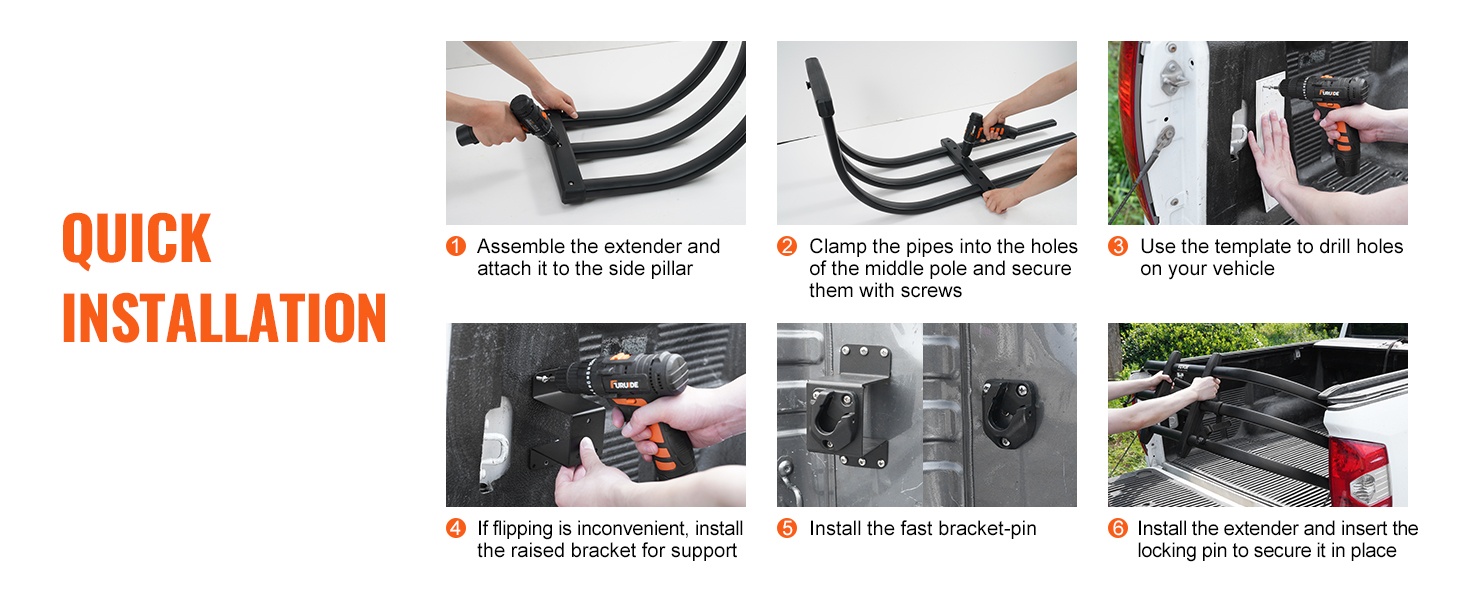 Pikakiinnitystappijärjestelmä tekee perälaudan jatkeen asentamisesta ja irrottamisesta nopeaa. Mukana tuleva porausmalline helpottaa oikeiden kiinnitysreikien merkitsemistä ja poraamista. 3 tuumaa korotetut kiinnitystelineet auttavat välttämään auton sivukiskojen aiheuttamia esteitä ja tekevät jatkeen kääntämisestä sujuvampaa.