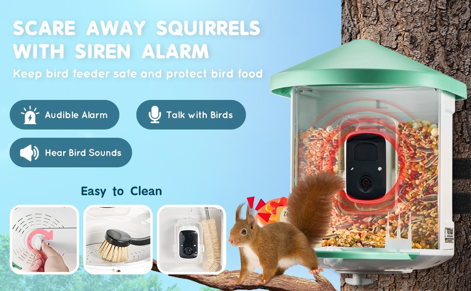- Kaksisuuntainen ääni ja äänivaroitus oravien karkottamiseen ja lintujen kuunteluun