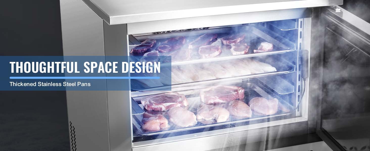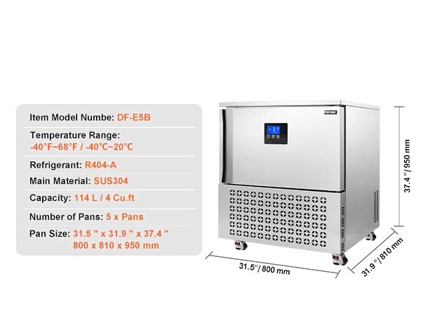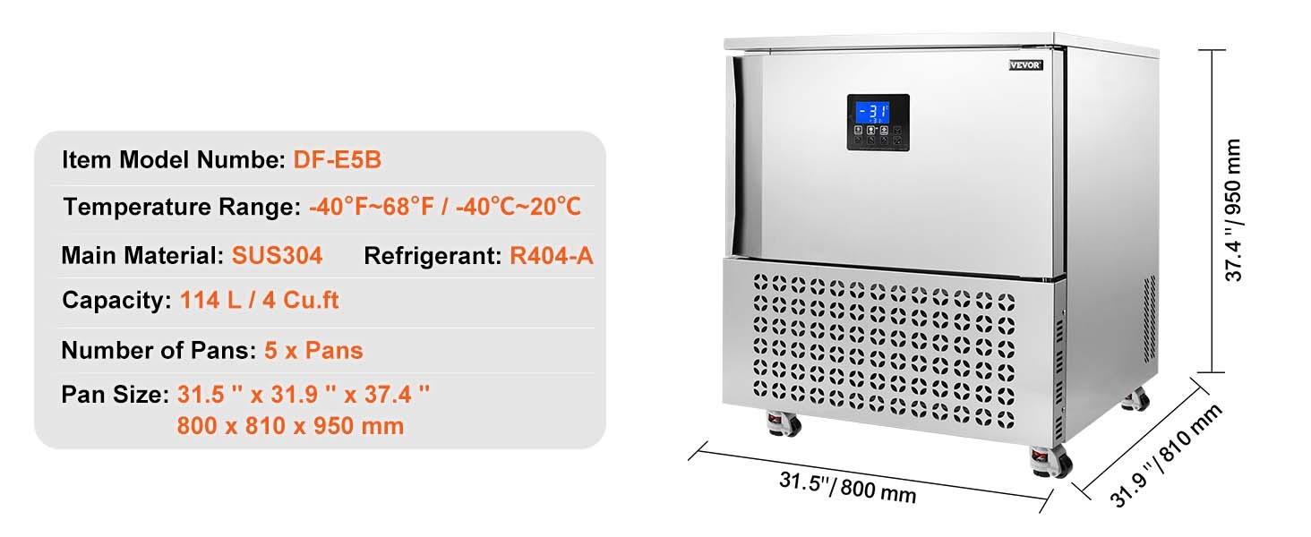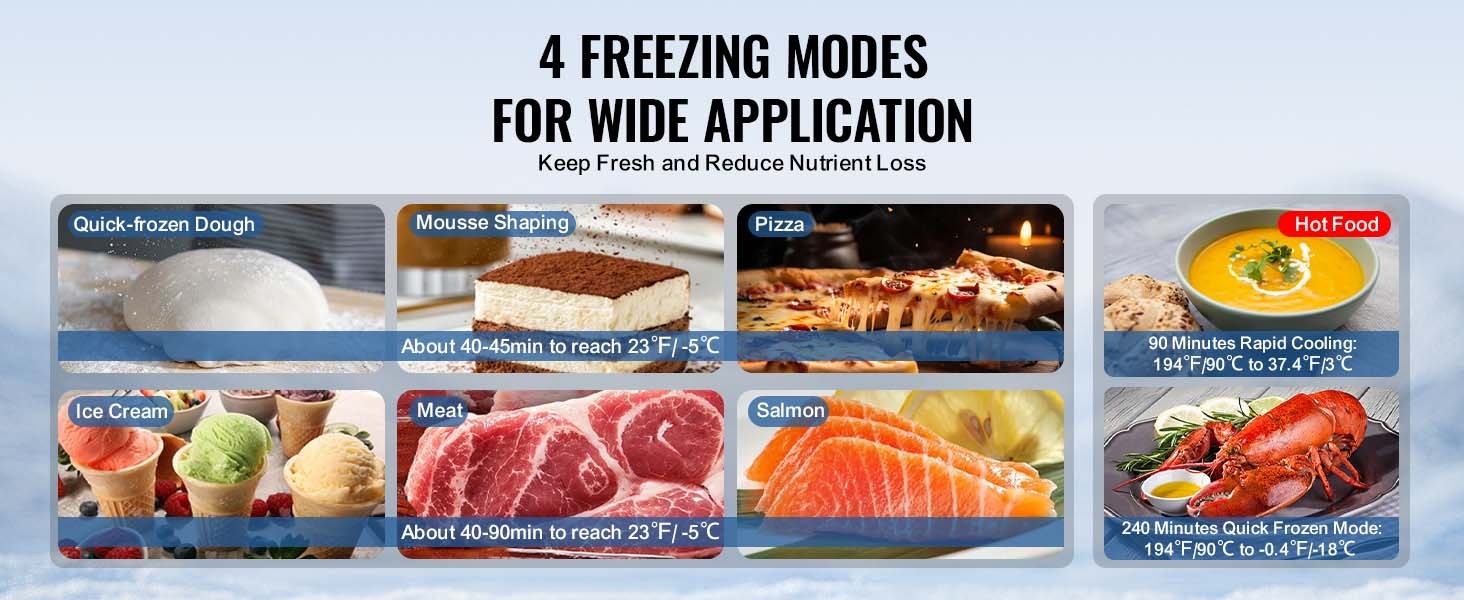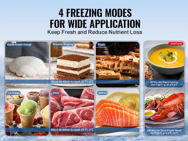 Tämä 114 L / 4 Cu.ft pikalämpötilapakastin on suunniteltu ammattikäyttöön ravintoloihin, suurkeittiöihin ja elintarvikevalmistukseen. Laitteella voi pakastaa nopeasti erilaisia raaka-aineita, kuten hummeria, kuningasrapua ja lohta, säilyttäen niiden tuoreuden, rakenteen ja ravintoarvot sekä pidentäen säilyvyysaikaa.
