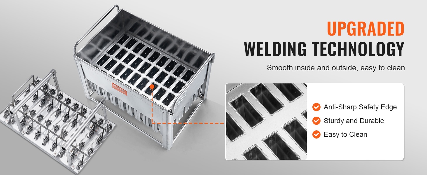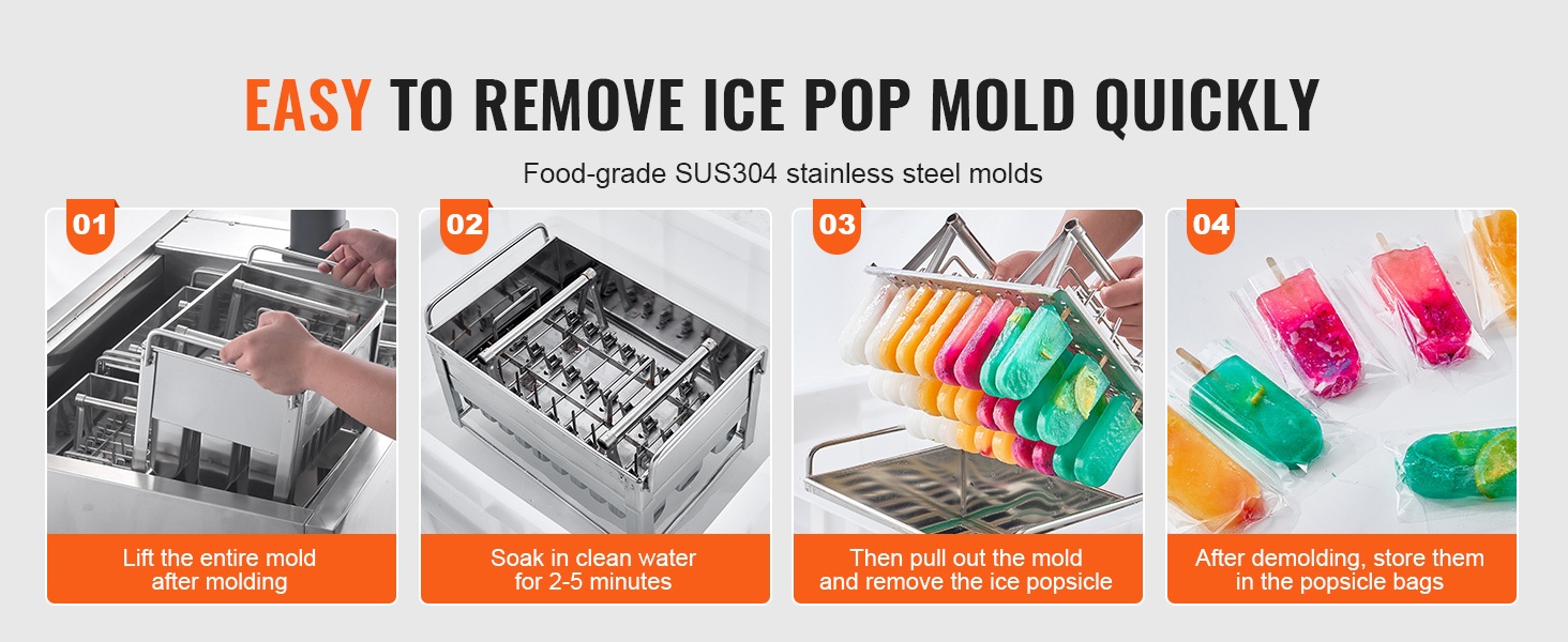 Muotit on valmistettu elintarvikekäyttöön soveltuvasta SUS304-ruostumattomasta teräksestä. Kun mehujäät ovat jäätyneet, nosta koko muotti, upota se puhtaaseen veteen noin 2–5 minuutiksi ja vedä sitten mehujäät helposti ulos. Valmiit mehujäät voidaan pakata kätevästi mehujääpusseihin säilytystä ja myyntiä varten.