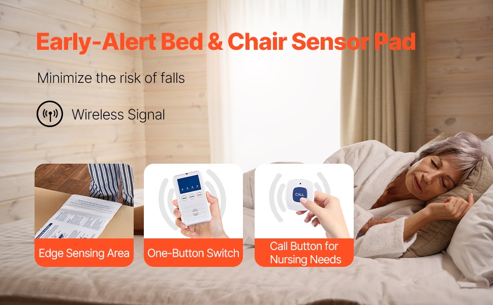 Tämä langaton sängyn hälytysjärjestelmä on suunniteltu ikääntyneiden ja potilaiden turvalliseen seurantaan kotona, sairaalassa tai kuntoutuskeskuksessa. Herkkä 14 x 30 -tuumainen anturityyny ja langaton kaukohälytin auttavat hoitajaa reagoimaan ajoissa ja vähentämään kaatumisriskejä.