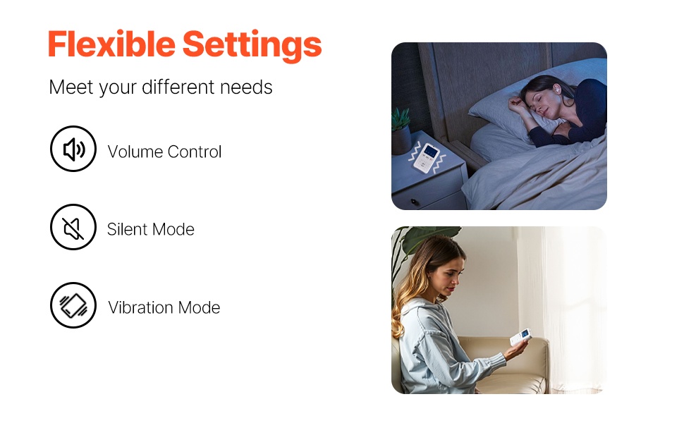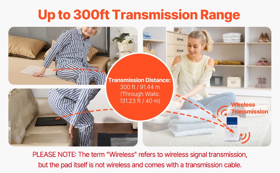Järjestelmä tukee jopa 300 ft langatonta kantamaa ja noin 131 ft seinien läpäisyä. Hoitaja voi liikkua vapaammin eri huoneissa ja silti vastaanottaa hälytykset ajoissa.
