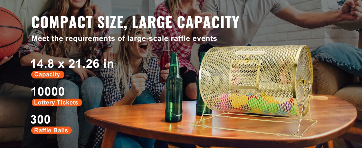 Rummun mitat ovat 16.1 x Ø12 in / 409 x Ø304 mm, ja se pystyy sisältämään noin 5000 arpalippua tai 200 pingispalloa. Se sopii hyvin suurille tilaisuuksille ja arvontoihin, joissa on runsaasti osallistujia.