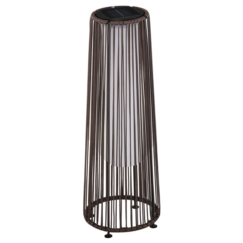 Valaisimessa on pulverimaalattu teräsrunko ja kestävä muovipunos, ja materiaalit ovat PE, teräs ja muovi. Väri on ruskea rottinkilookki ja valo on lämpimän keltainen.