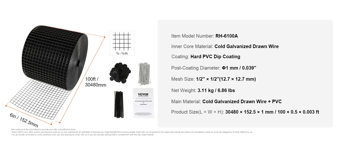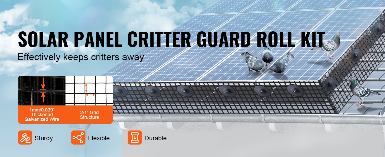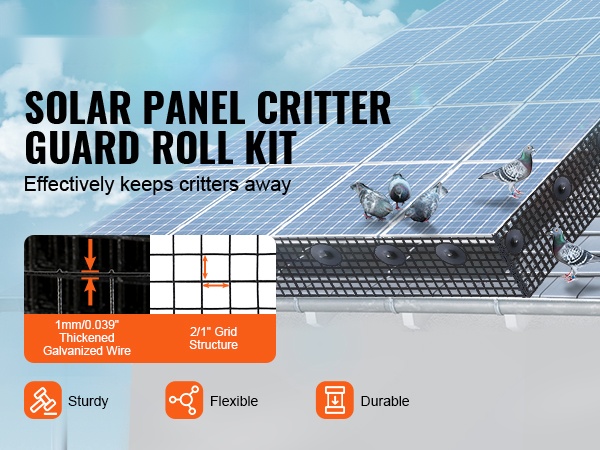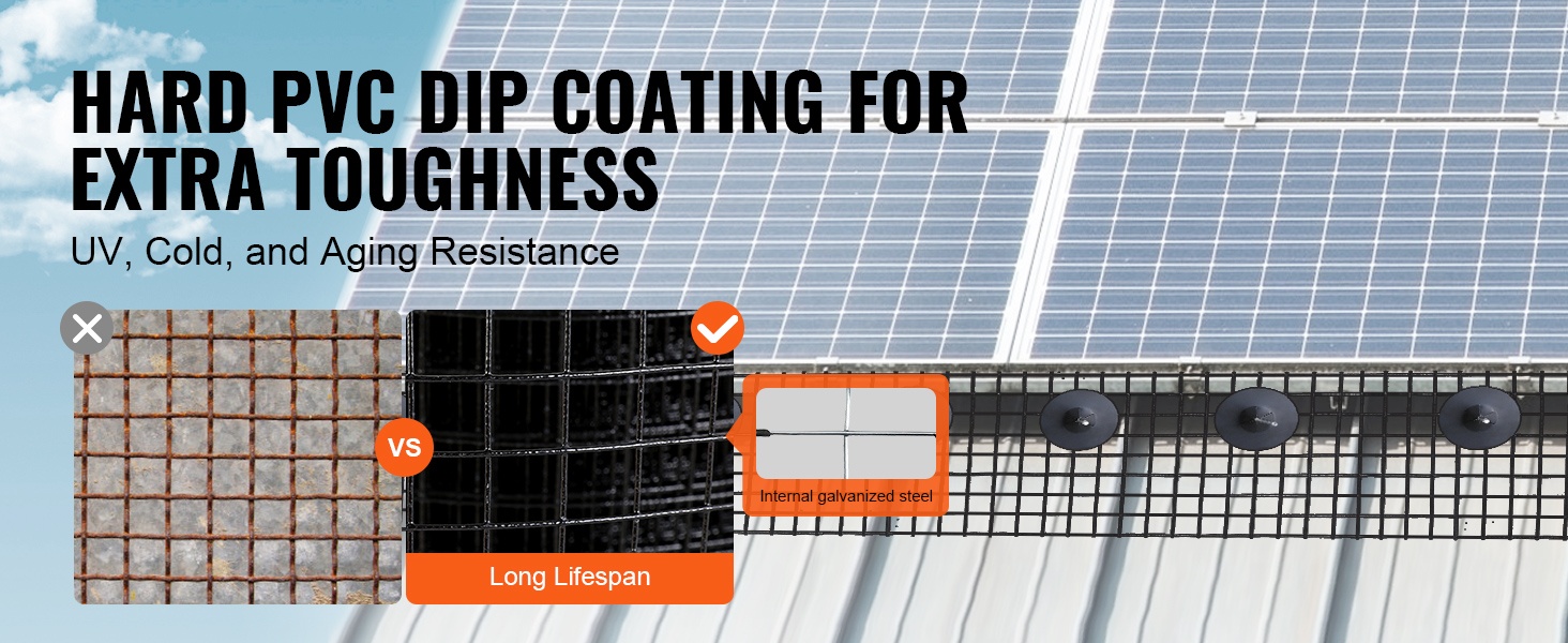 Tämä aurinkopaneelisuojaverkko estää linnut ja muut pienet eläimet pääsemästä paneelien alle tai lähelle. Sinkitystä teräslangasta valmistettu ja PVC-pinnoitteella päällystetty verkko tarjoaa kestävän, vakaan ja ruostumista hyvin vastustavan suojan. Soveltuu myös muuhun suojakäyttöön, kuten puutarhoihin ja rakennusten yksityiskohtiin.