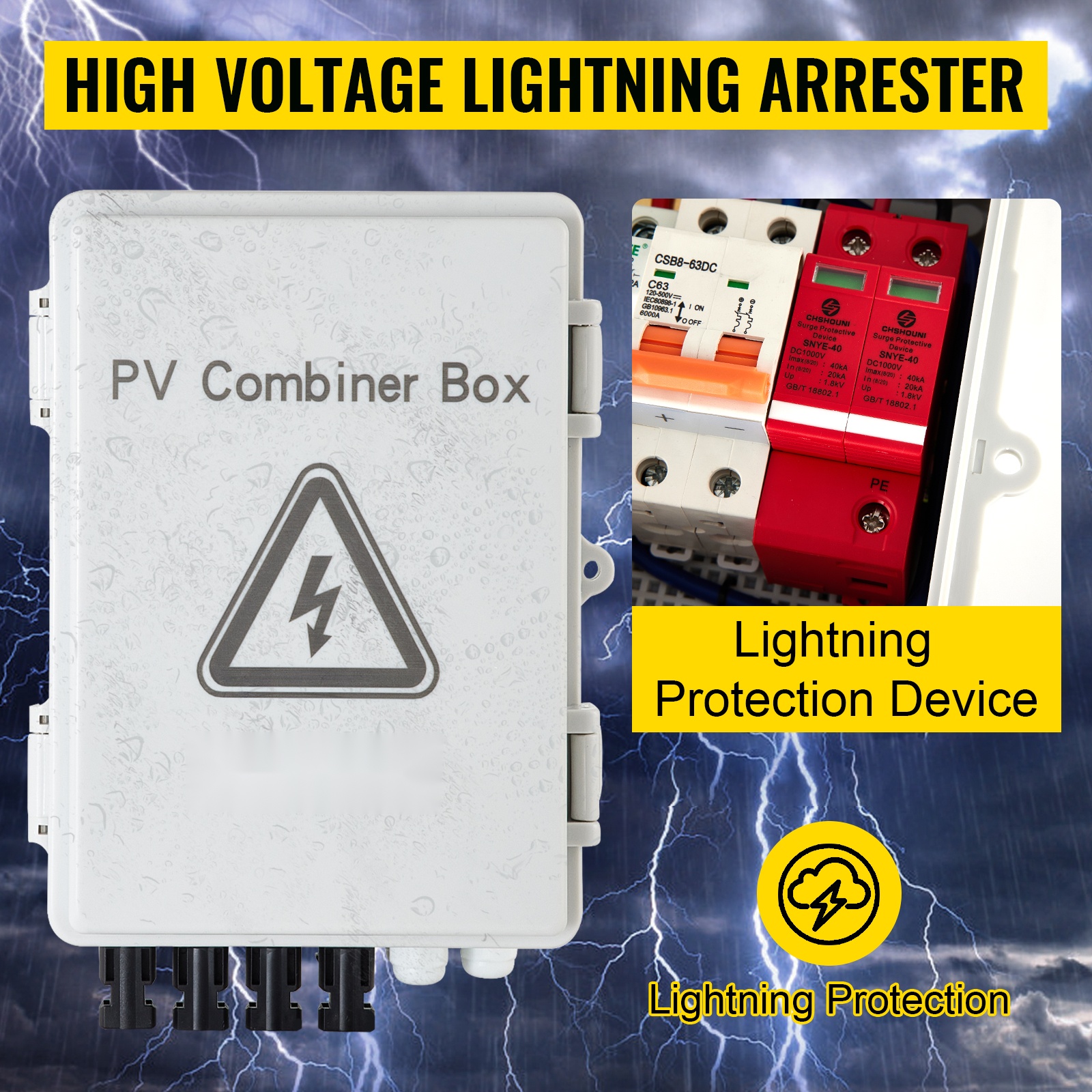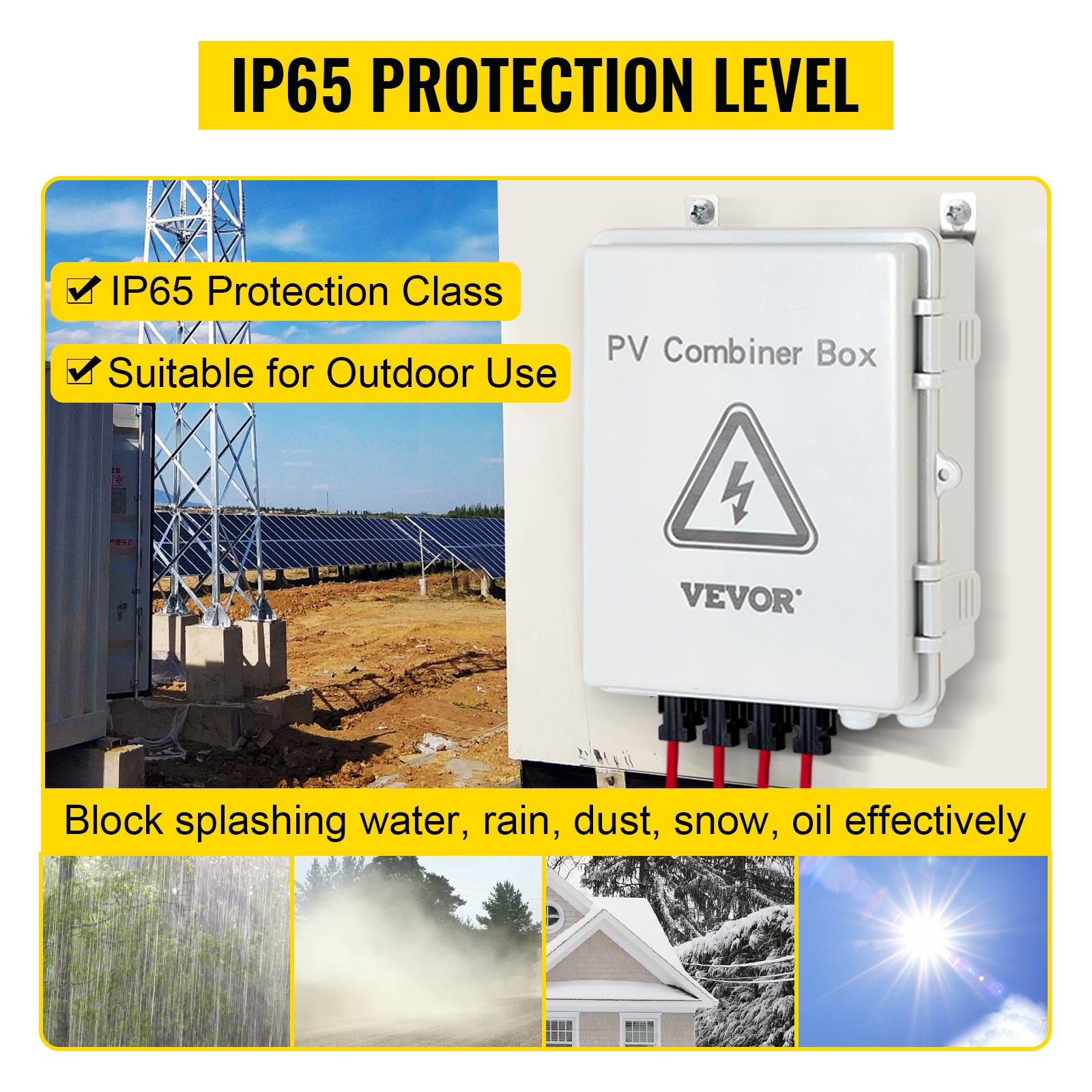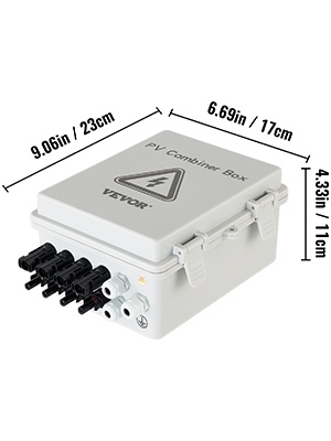 Tämä 4-tuloinen PV-yhdistelmärasia helpottaa aurinkopaneelikentän kytkentää invertteriin ja suojaa järjestelmää useilla turvatoiminnoilla. IP65-roiske- ja pölysuojaus, ylijännitesuoja (salamasuojaus), 15A DC-sulakkeet ja 63A tasavirtakatkaisija tekevät siitä sopivan sekä verkkoon kytketyille että off-grid-aurinkosähköjärjestelmille.