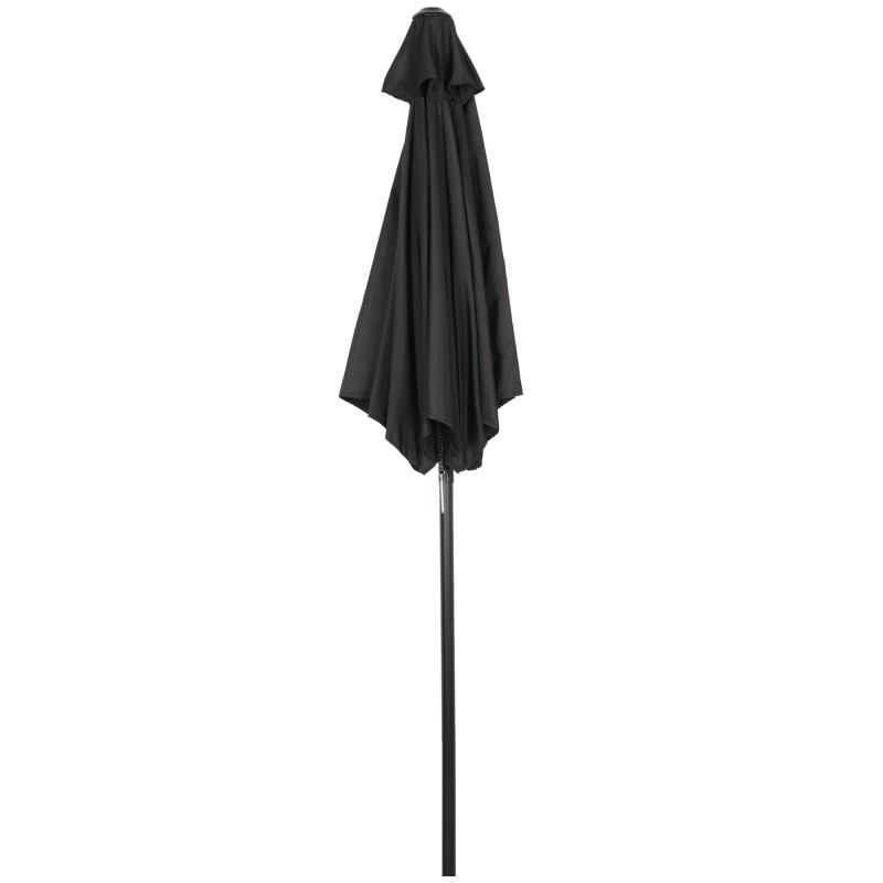 - Alumiinirunko, jossa kuusi teräsvartta, pitää varjon jämäkästi pystyssä ja tukee kattokangasta.