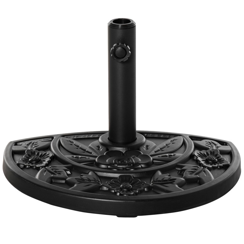 Tällä puoliympyrän muotoisella aurinkovarjon jalalla viimeistelet parvekkeen tai terassin kalustuksen tyylikkäästi ja pidät varjon tukevasti paikallaan. Jalusta on valmistettu HDPE-muovin, sementin ja metallin yhdistelmästä, painaa 9 kg ja kestää sateen, tuulen ja vuodenajan vaihtelut. Hillityn musta pinta on koristeltu kauniilla kukkukuviolla, joka tuo ulkotilaan huomaamatonta ilmettä.