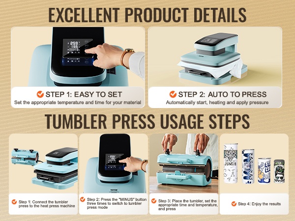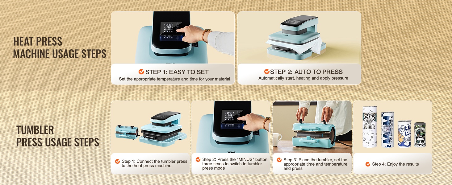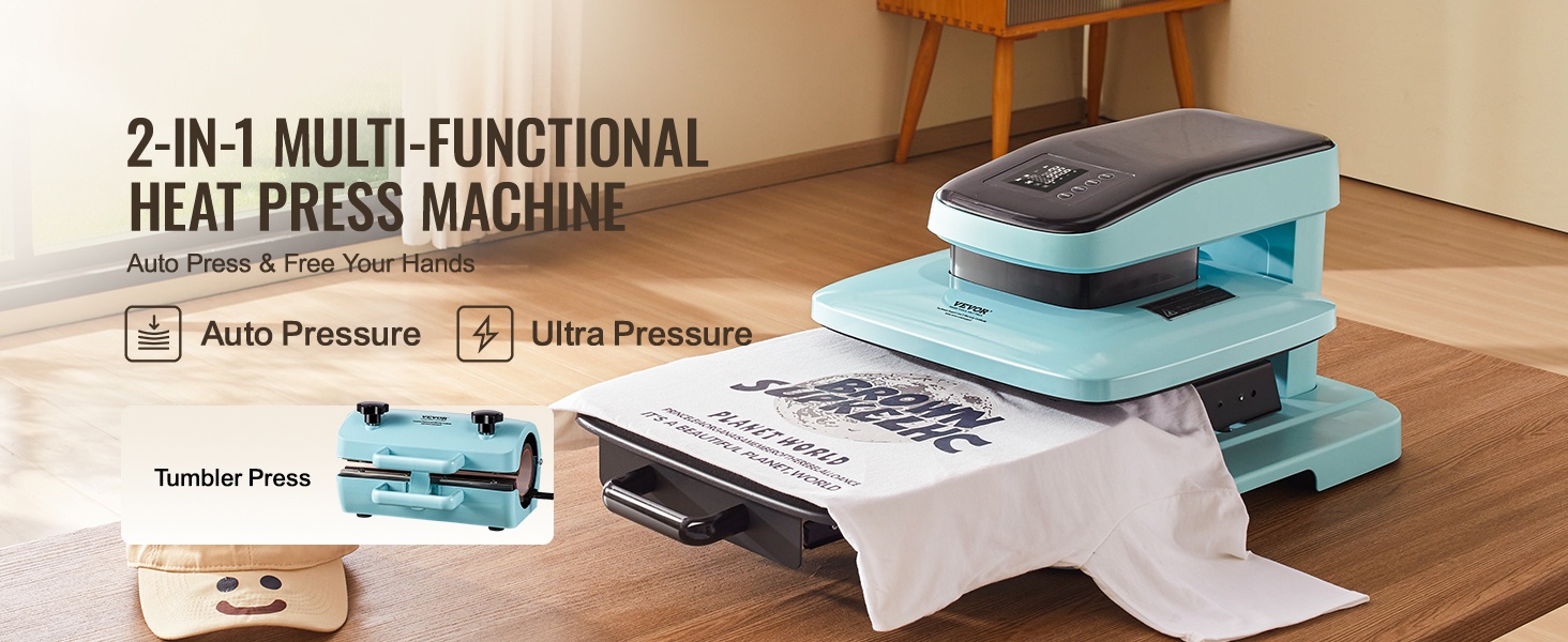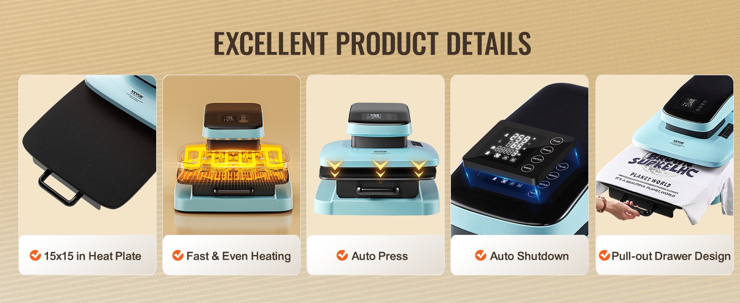 Automaattinen lämpöprässäyslaite helpottaa tekstiilien ja mukeihin tehtävien siirtokuvien tekemistä. Kone laskeutuu kevyestä painalluksesta itse alas ja nousee ylös, kun prässiaika on ohi – ilman jatkuvaa käsin painamista.