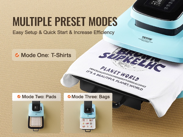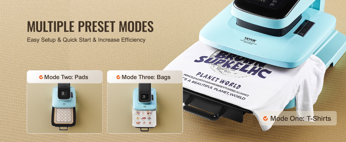 Laitteessa on kolme päätilaa: tyynyille, T-paidoille ja kangaskasseille. Näiden avulla löydät nopeasti sopivat perusasetukset ilman, että sinun tarvitsee säätää aikaa ja lämpötilaa alusta asti joka kerta. Tämä tekee käytöstä helppoa myös aloittelijoille.