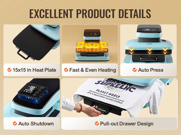 15 x 15 in / 381 x 381 mm kokoinen levy tarjoaa runsaasti työtilaa. Voit prässätä suuria kuvioita tai useita pieniä tuotteita kerralla, mikä tehostaa työskentelyä. Sopii esimerkiksi kangaskasseihin, T-paitoihin, pöytätabletteihin ja tyynyliinoihin.