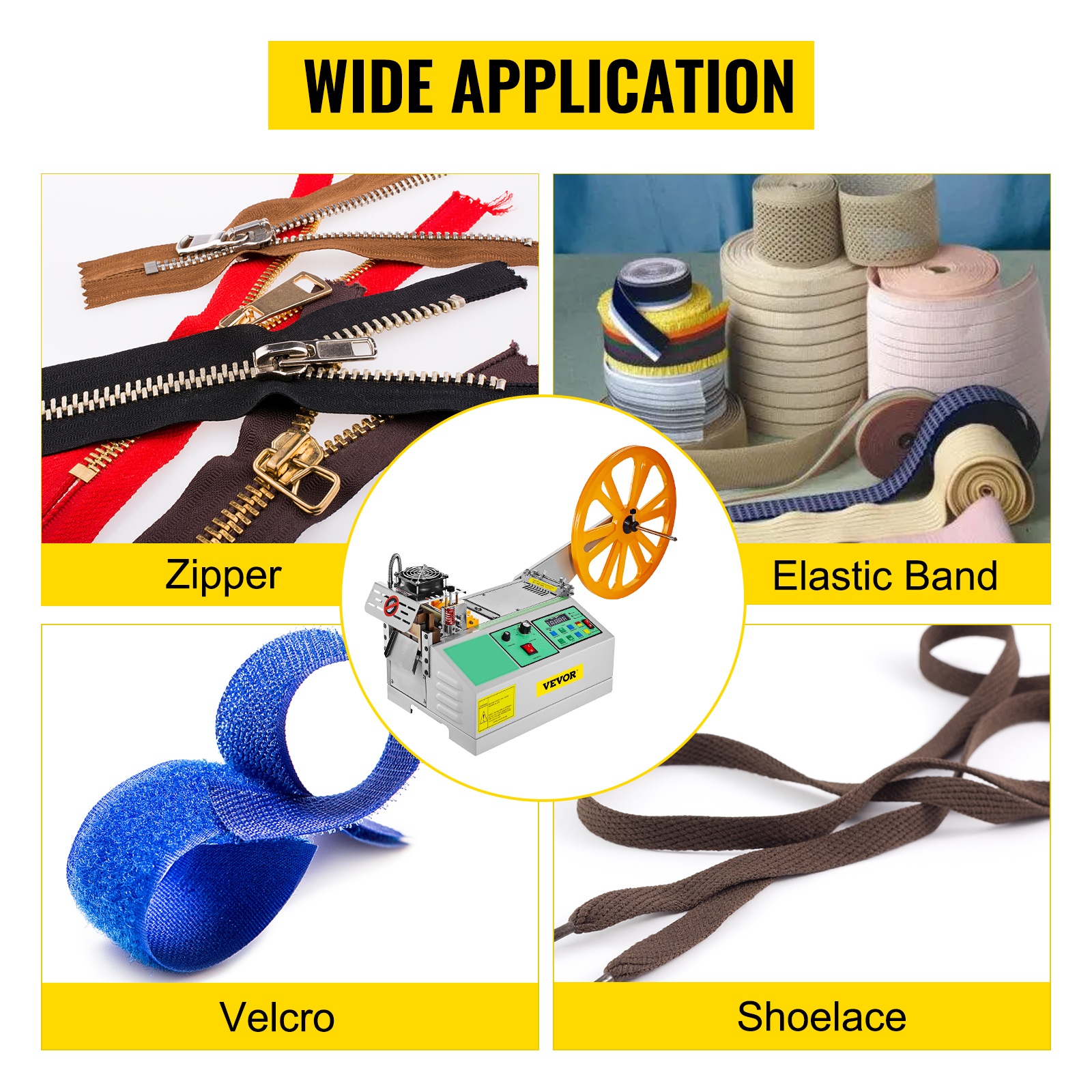 Laite soveltuu monentyyppisten nauhojen leikkaamiseen, kuten nylonhihnat, tarranauhat, vetoketjunauhat ja joustavat vyöt. Käyttökohteita ovat esimerkiksi vaatteet, kengät, tekstiilit ja muut valmistustuotteet.
