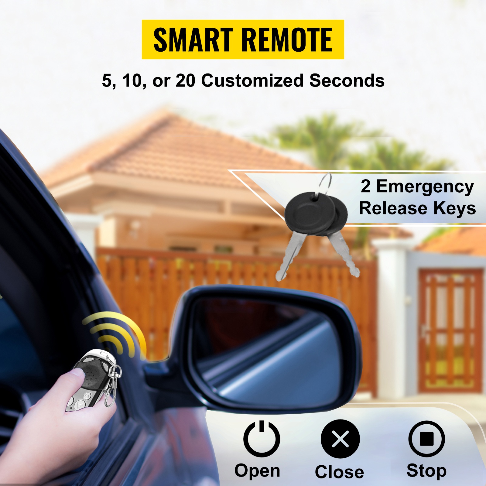 Kaukosäätimellä voit avata, sulkea ja pysäyttää portin jopa 100 ft / 30 m etäisyydeltä. Mukana tulevat 2 manuaalista hätäavausavainta, joilla portin voi avata käsin sähkökatkoksen tai kadonneen kaukosäätimen tapauksessa. Portti sulkeutuu automaattisesti avautumisen jälkeen, ja sulkeutumisen viiveen voi asettaa 5, 10 tai 20 sekuntiin.