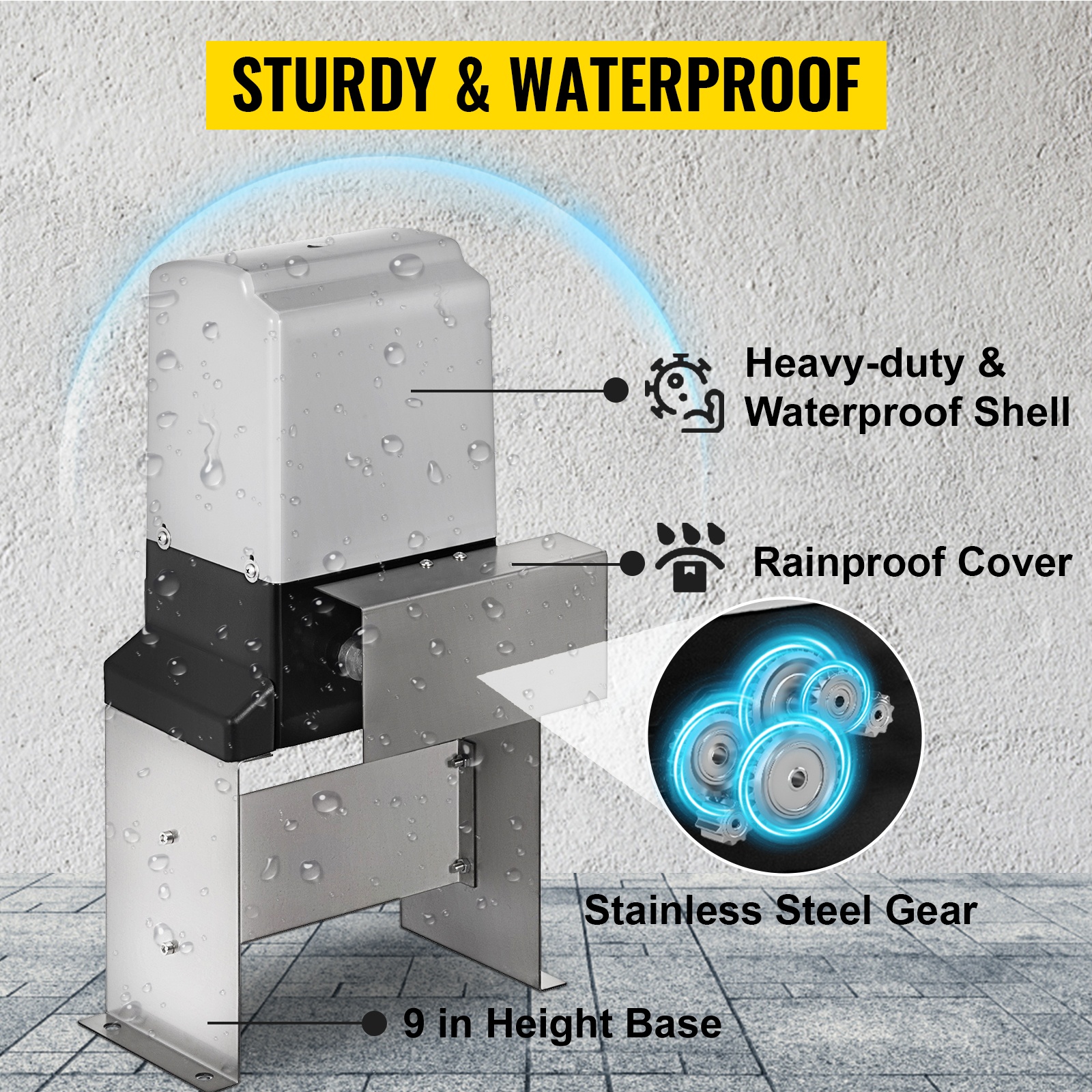 Vahva ja vesitiivis kotelo suojaa moottoria säältä ja vaurioilta. Ruostumattomat teräsrattaat ja sadesuoja estävät korroosiota. 9 in -korkuinen pohjalevy auttaa pitämään laitteen kuivana myös rankkasateilla.