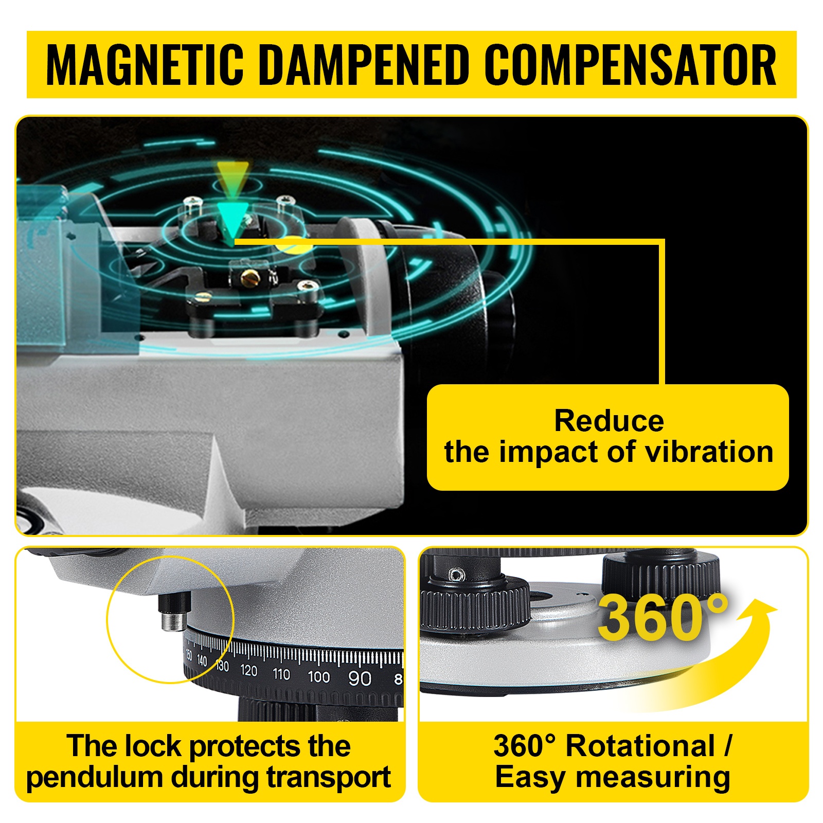 Itsetasaava, magneettisesti vaimennettu kompensaattori vähentää tärinän vaikutusta mittauksiin. Kuljetuslukko suojaa kompensaattoria siirron ja varastoinnin aikana.