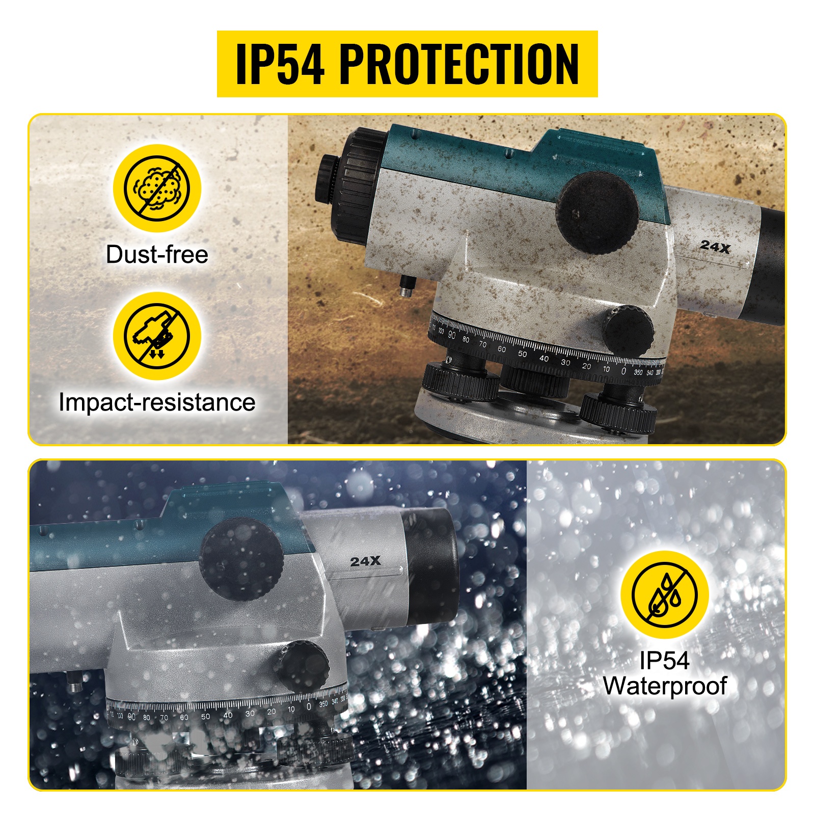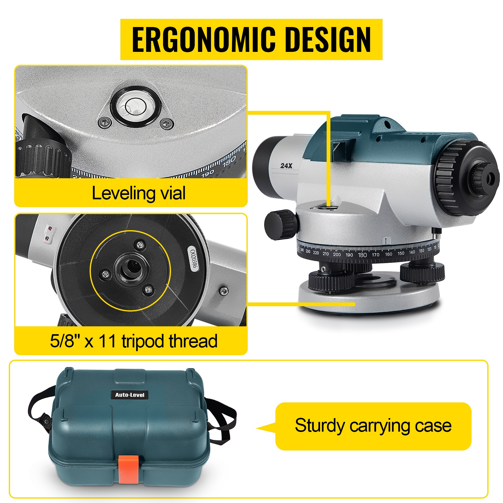Automaattinen optinen vaaituslaite, jossa on 24X suurennus ja 40 mm aukko. Itsetasaava kompensaattori ja kuljetuslukitus helpottavat käyttöä työmaalla. Laite tarjoaa tarkan korkeuden, etäisyyden ja kulman havainnoinnin jopa 393 jalkaan / 120 m saakka. IP54-suojaus ja tukeva muovinen kuljetuslaukku tekevät siitä käytännöllisen valinnan rakennus- ja mittaustöihin.