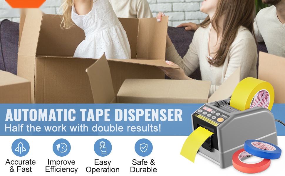 Tämä automaattinen teippileikkuri helpottaa pakkaus- ja teippaustöitä toimistoissa, varastoissa, tuotannossa sekä myymälöissä. Laite syöttää ja katkaisee teipin tarkasti valitsemaasi pituuteen, ja käytettävissä on sekä käsikäyttöinen että automaattinen tila.