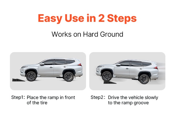 Turvallisen käytön varmistamiseksi aseta huoltorampit aina kovalle, hyvin kitkaa tarjoavalle alustalle ennen rampille ajoa. Näin rampit pysyvät vakaasti paikoillaan ja tukevat ajoneuvoa luotettavasti.